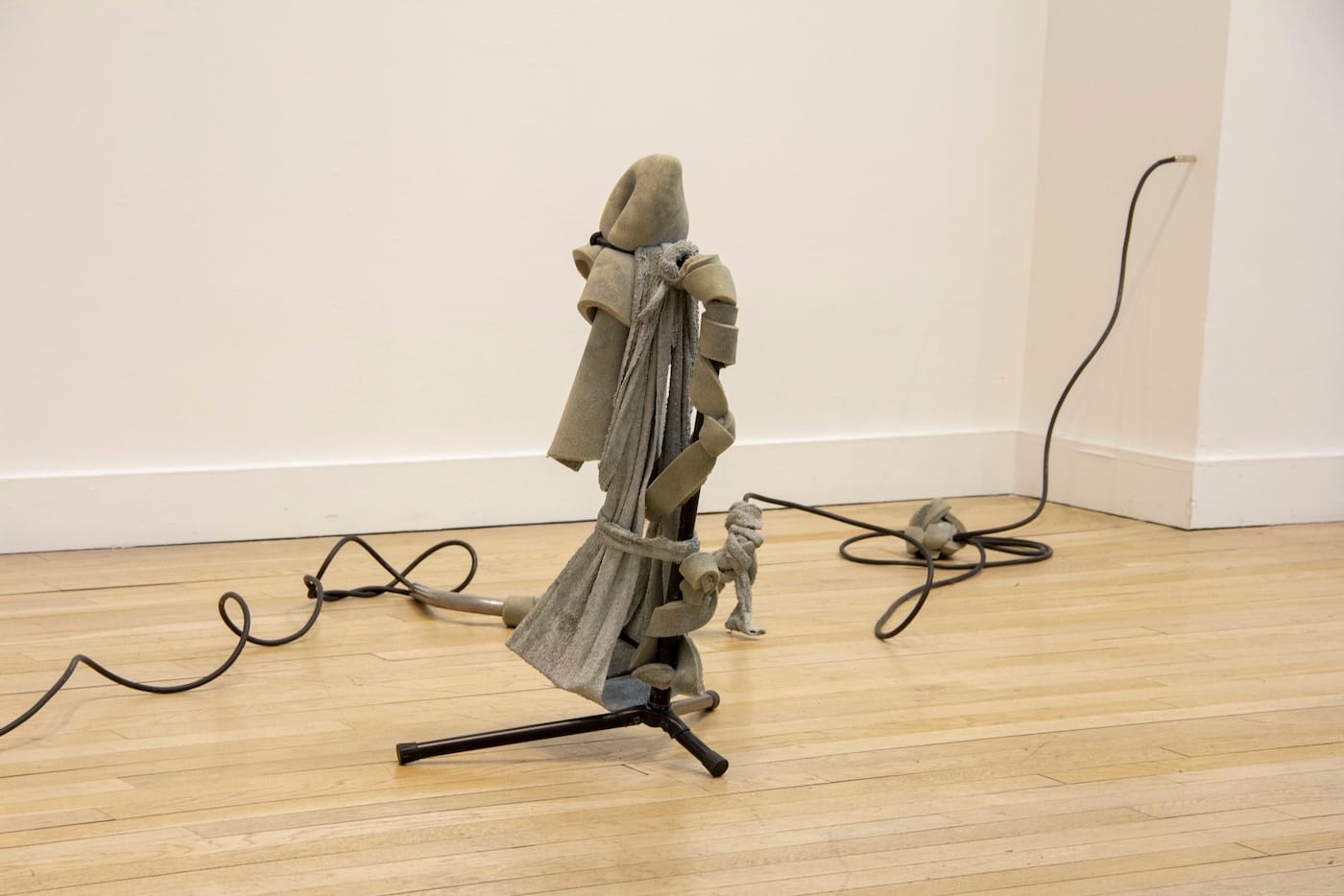 Sound and its opposite are also the subject of Nikita Gale’s contributions, sculptures that entwine sound-abetting equipment (guitar stands and audio cables) with sound-suppressing materials (terrycloth and polyurethane foam, deceptively stiffened with concrete).