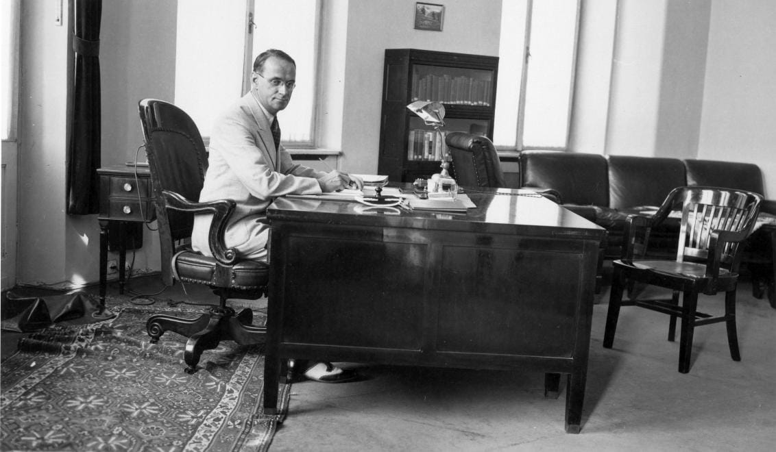 During his lecture, Török highlighted several rare Holocaust-related photos that took extensive effort to acquire. One shows a somber man sitting upright behind his desk. It’s Carl Lutz, the Swiss diplomat responsible for saving thousands of Hungarian Jews inside the basement of his glass factory in Budapest. Images of Lutz’s Glass House from the war-torn 1940s are practically nonexistent, but after six months of correspondence with Lutz’s daughter and the Zurich Institute of Technology, Török was able to obtain two. Now anyone with an internet connection can view and download these pictures.