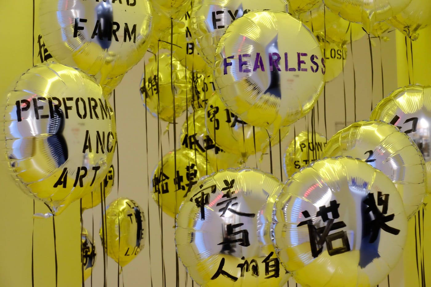 This year 13 artists created installations, such as the large one by Jesus Benavente, titled “I Still Remember You Mijo” (2018), consisting of large, red vinyl lettering spelling out the title of the piece, along with about 600 air-filled white balloons that slowly deflate. It evokes Benavente’s distress as a Mexican-American who has witnessed the malevolence toward immigrant communities leveled by the current federal administration, such as the separation of families at the border. Furen Dai’s “Silverwords” (2018) also consisted of balloons with black vinyl lettering spelling out phrases like “against the tide,” and “fearless,” while some words appeared to be written in Chinese characters. The overlap of their work speaks to New York’s art community, which largely consists of immigrants and has international connections; the precarity of the immigrants’ lives is poignantly evoked by the ephemeral balloon.