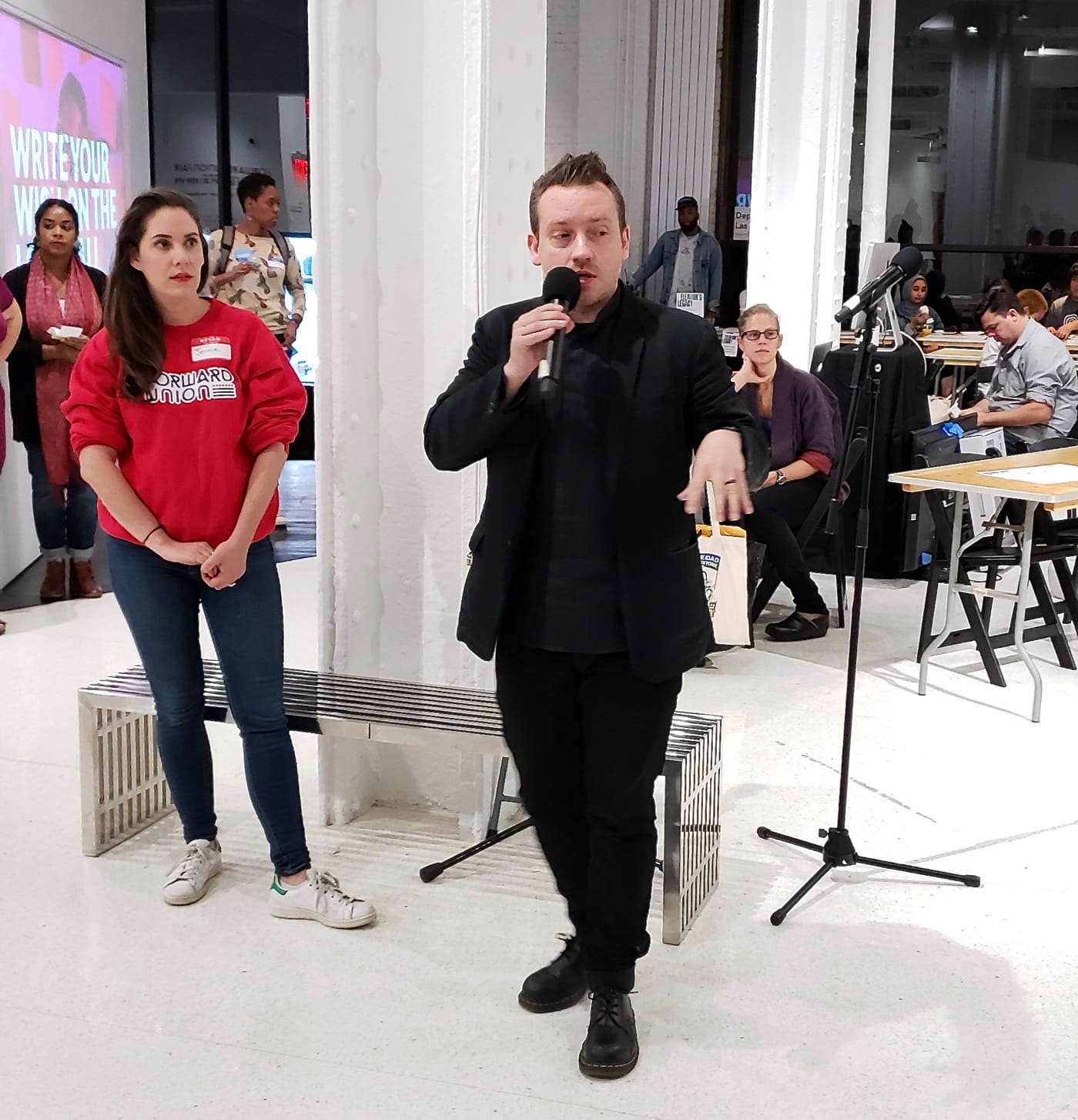 The political significance of this work mirrors the themes I gathered as I watched and listened to the opening remarks on Saturday, September 29. The master of ceremonies, James O’Brien, officially opened the fair to the public at noon and invited Lamensdorf to talk about the general aims of the fair and what initially animated the event (the presidential election of 2016). Immediately after, several representatives of organizations talked about their aims, among them Shijuade Kadree of the New York City LGBT Center, Katie Robbins of the Campaign for New York Health, and No Longer Empty‘s Youth Action Council, which included 11 young people who spoke about the concerns that motivated their involvement. They all spoke with a clear sense of purpose. In addition to these groups, other organizations that were involved include Artistic Freedom Initiative; Resistbot; Make the Road New York; Parade/The Young and Mighty March for a Voice; Theatre of the Oppressed; Spaceworks; New Yorkers Against Gun Violence; and the Climate Mobilization.