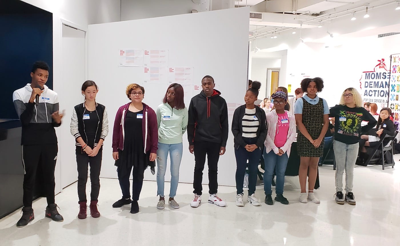 The political significance of this work mirrors the themes I gathered as I watched and listened to the opening remarks on Saturday, September 29. The master of ceremonies, James O’Brien, officially opened the fair to the public at noon and invited Lamensdorf to talk about the general aims of the fair and what initially animated the event (the presidential election of 2016). Immediately after, several representatives of organizations talked about their aims, among them Shijuade Kadree of the New York City LGBT Center, Katie Robbins of the Campaign for New York Health, and No Longer Empty‘s Youth Action Council, which included 11 young people who spoke about the concerns that motivated their involvement. They all spoke with a clear sense of purpose. In addition to these groups, other organizations that were involved include Artistic Freedom Initiative; Resistbot; Make the Road New York; Parade/The Young and Mighty March for a Voice; Theatre of the Oppressed; Spaceworks; New Yorkers Against Gun Violence; and the Climate Mobilization.