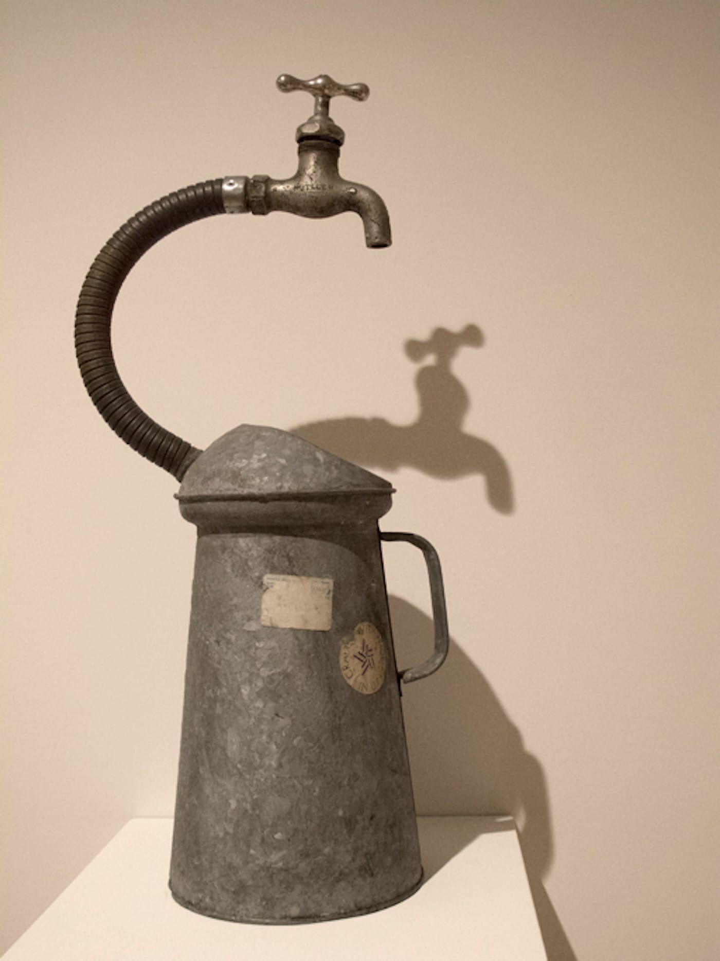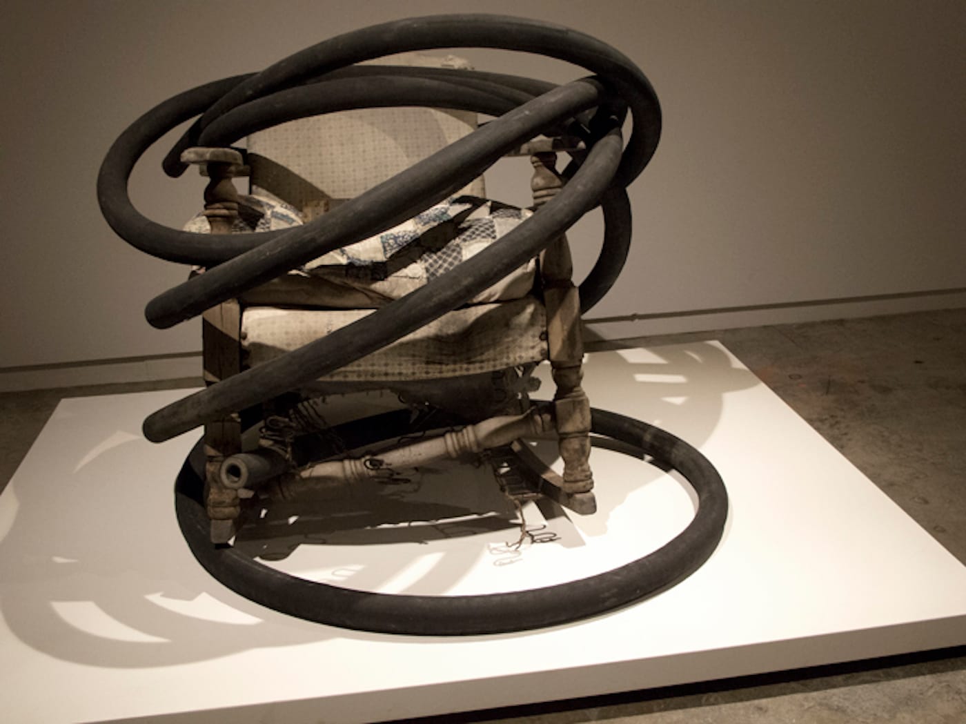 For example, in “Weighted Down by the Hose” (2008), we see a beat-up old upholstered chair wrapped in a massive fire hose, preventing the chair from its intended use. A piece of an old tattered quilt sits neatly on the chair, a small box nestled in its folds. The huge, forceful shape of the hose is both a strong abstract gesture in space and a reminder of how serpentine and destructive such a thing can be.