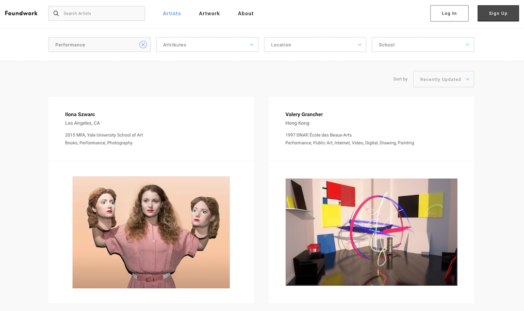 Foundwork provides a focused, noise-free venue for artists to share their work with a relevant international audience — and for curators, gallerists, and others to research and engage with participating artists wherever they’re located. Artists manage their own profiles and can share their CV, an artist statement, and unlimited work — and the site is searchable across a range of key criteria including school, degree type, class year, artist location, artwork format, and descriptive attributes which artists assign themselves, informing their context on the platform.