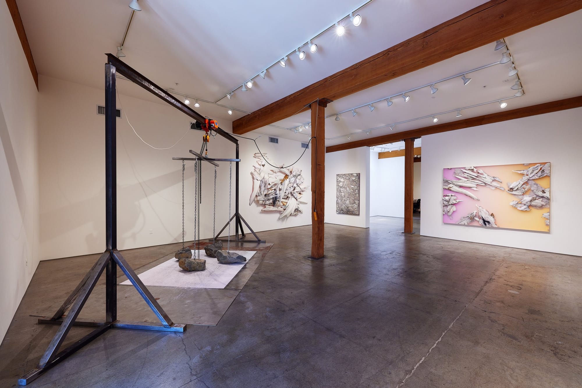 When I visited the gallery one quiet summer afternoon, two shows were on view: long-time gallery artist Ed Bereal’s Wanted: Ed Bereal for “Still Disturbing the Peace" and Peter Gronquist’s Manifest. Bereal used a 3D printer to make sculptural installations he calls “topographical drawings,” showing figures entrapped in what looks like the American flag. Gronquist works with materials including bits of lace and ash along with polyurethane molded to resemble bone fragments, painting them in white, pink, and orange hues that recall the nearby Columbia River Gorge. The combination of these two exhibitions — one by an artist who has been active since the ’60s presenting new political work that’s visually compelling, another by a Portland creator using materials in an arresting way to comment on his home — capture what makes Elizabeth Leach's gallery so special.