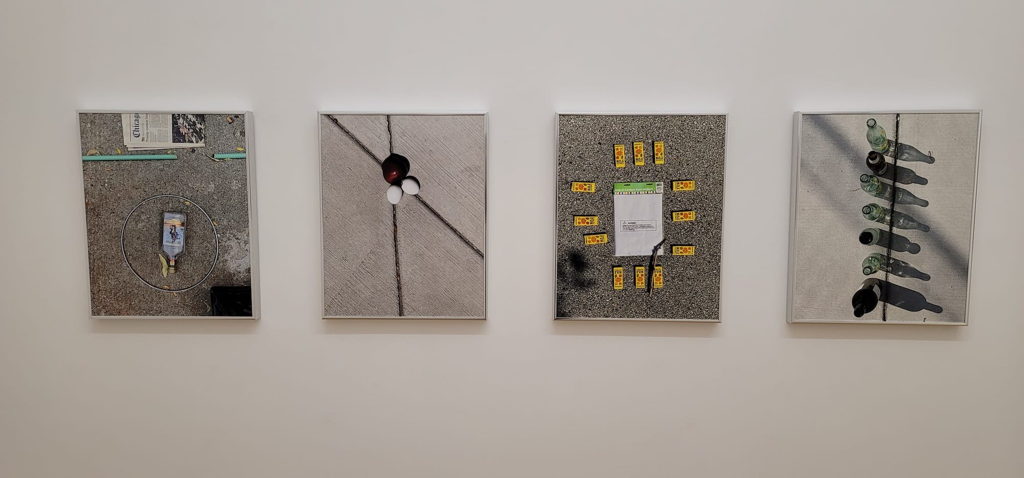 Ten of these pictures are on view in Cowboy X Lightbound X Cowboy at Paris London Hong Kong, a tiny gallery whose aesthetic force often feels inversely proportional to its square footage. (The photos are for sale, with a portion of the proceeds going to the Chicago Coalition for the Homeless and the remainder being set aside for Cowboy, whose whereabouts are currently unknown.) The compositions fascinate for the sense of orderliness imposed therein. Cowboy achieves this via geometry: placing a red apple and two eggs at the crossing of sidewalk contraction joints; laying a circular chartreuse hairband at the center of a chaotic pile of Chex cereal squares; arraying nine packets of crayons evenly around a rectangular sheet of stickers. For a moment, at least, everything has a place and that place is pleasing.