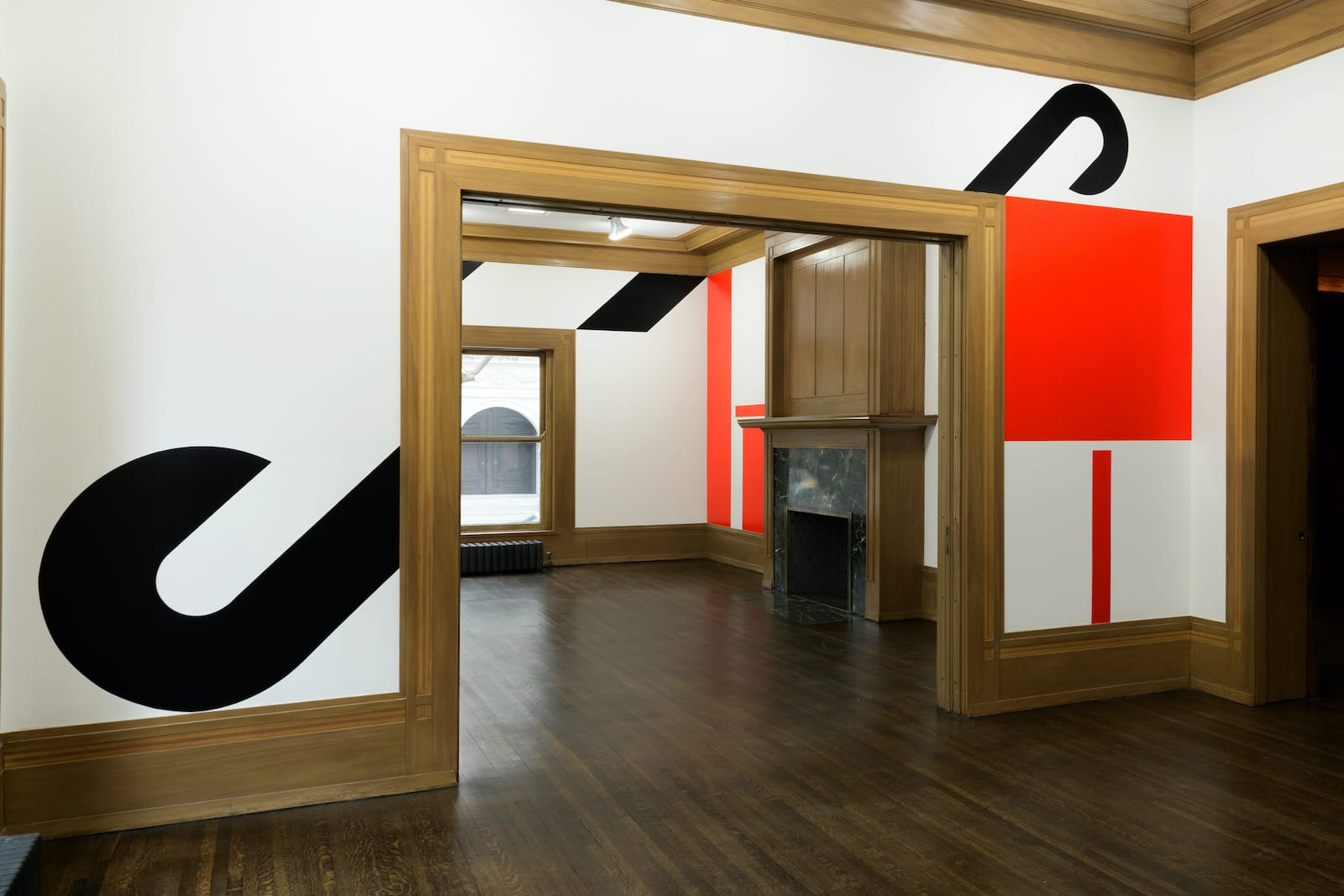 The nonagenarian San Francisco designer Barbara Stauffacher Solomon is something of a genius at getting people to perceive the connections between this and that, in the way that might happen if an architect and a typographer went out dancing one night. The answer to that almost-joke is Exits Exist, her supergraphics installation at the Graham Foundation’s Madlener House. On the walls of the Prairie-style mansion’s elegant downstairs galleries, still decorated with original moldings and fireplaces, she’s painted thick curves, diagonals, lines, and blocks in black and the vermillion of those ubiquitous egress signs.