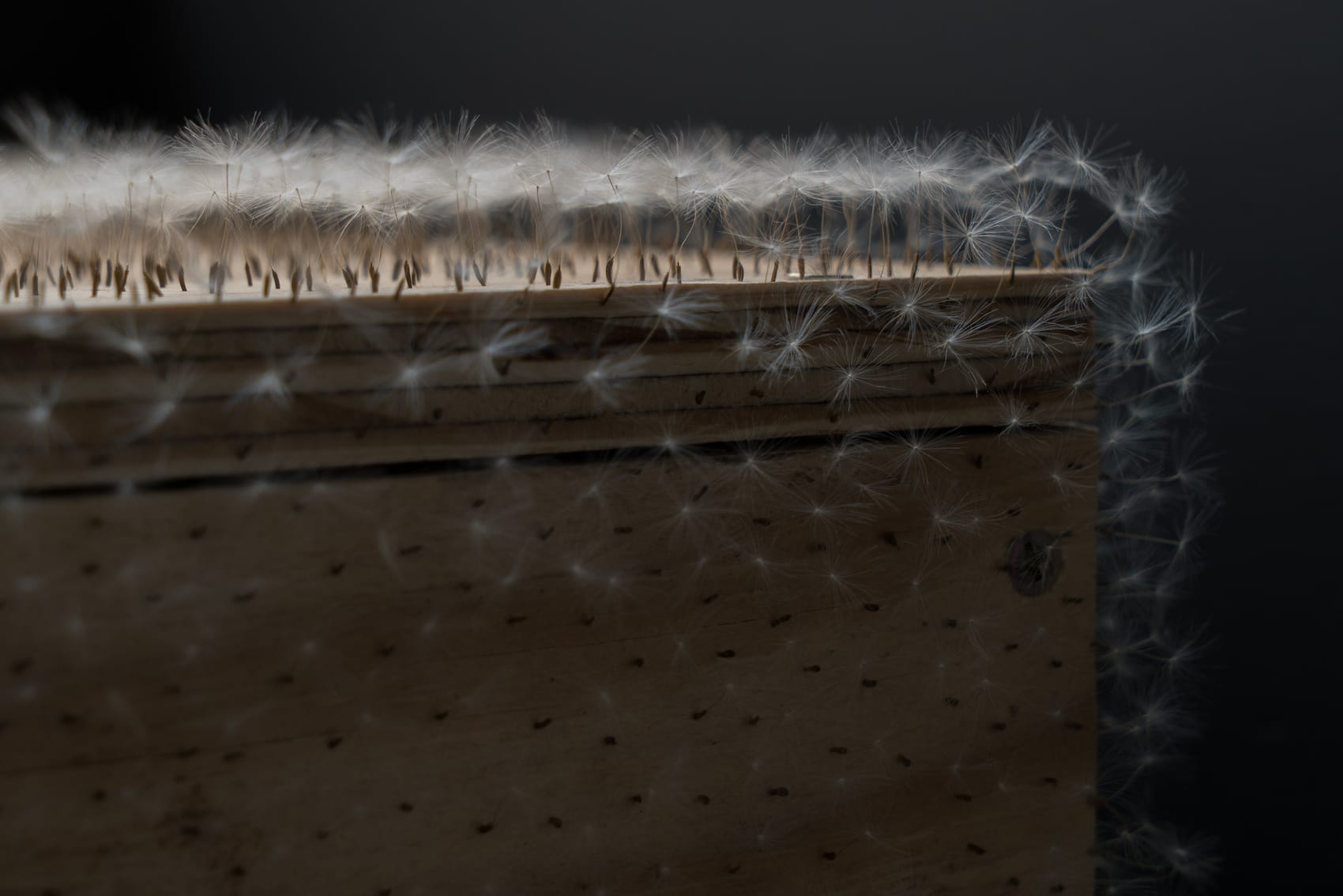 Okay then, an ingenious arrangement can engender awareness of spatial relationships, provide a much-needed sense of order, or offer purely aesthetic mysteries. Check! At the Chicago Artists Coalition, where resident Selva Aparicio has installed a simple casket covered in innumerable dandelion seeds, something entirely other occurs through those means, something that squeezes the heart tightly with sadness, then releases it in wonder. Ode to the Unclaimed Dead, displayed in a recessed niche evocative of Spanish burial traditions, appears from afar as if encased in a softly glowing halo. Up close, the wooden box is like gooseflesh, each of the tens, or maybe hundreds of thousands of seeds individually distinguishable, having been painstakingly affixed to the pine boards, one by one, with tweezers and imperceptible dabs of glue. The combined effect is of ennobled personhood, extended in requiem to those countless bodies that go untended after death — interred in mass coronavirus graves, buried under the rubble of war-torn Ukrainian cities, and so on, moving backwards through the cruel endings of human history, arranged.