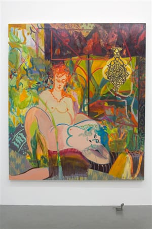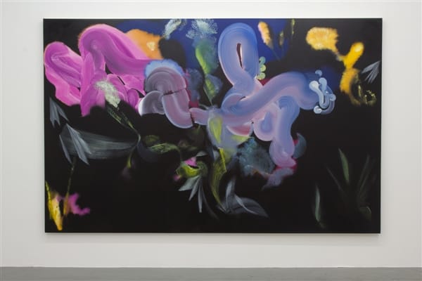 Jacki Gendel’s painting is the final in this quartet or works. The canvas lends a more literal figurative tune to the chorus of irreverent loose painting on display. Her work learns as much from psychedelic colors as it does from a kind of gaudy, boozy Matisse.