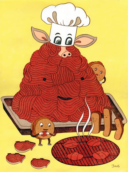 The mellow and colorful multi-color woodcut prints by Jing Wei tell stories the way the best children’s books do: with imagination, gentle fervor, and ridiculous cuteness. Pastel yellow backgrounds represent a hazy sunny day in which a giant pile of spaghetti donning a pig’s nose and a chef’s hat watches a fiery grill alongside burgers and hot dogs (at left). A sick armadillo lays sadly in bed, strangely encased inside a jello Bundt cake. An origami folded bear, white and flattened, hungrily swipes at fish by the waterside. Angular lines and geometric shapes mix with a subtle color palette, altogether combining quirky patterns with humorous, surreal and slightly disturbing storybook narratives.