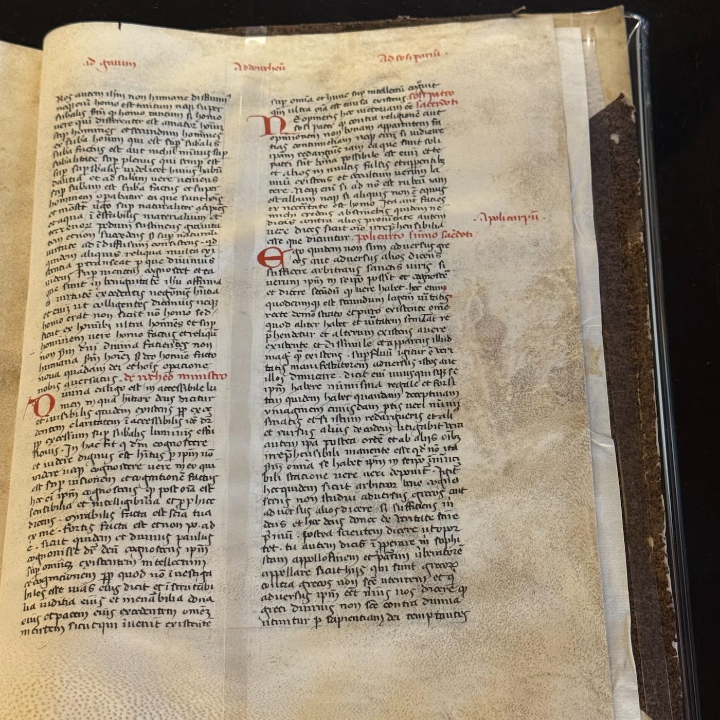 What the curators have featured, in the monastery's former library, is a 14th-century manuscript of Pseduo-Dionysius the Areopagite. Giovanni di San Gimignano connected his own marble, stone, and crystal metaphors with the notion of dissemblance advanced in this manuscript.