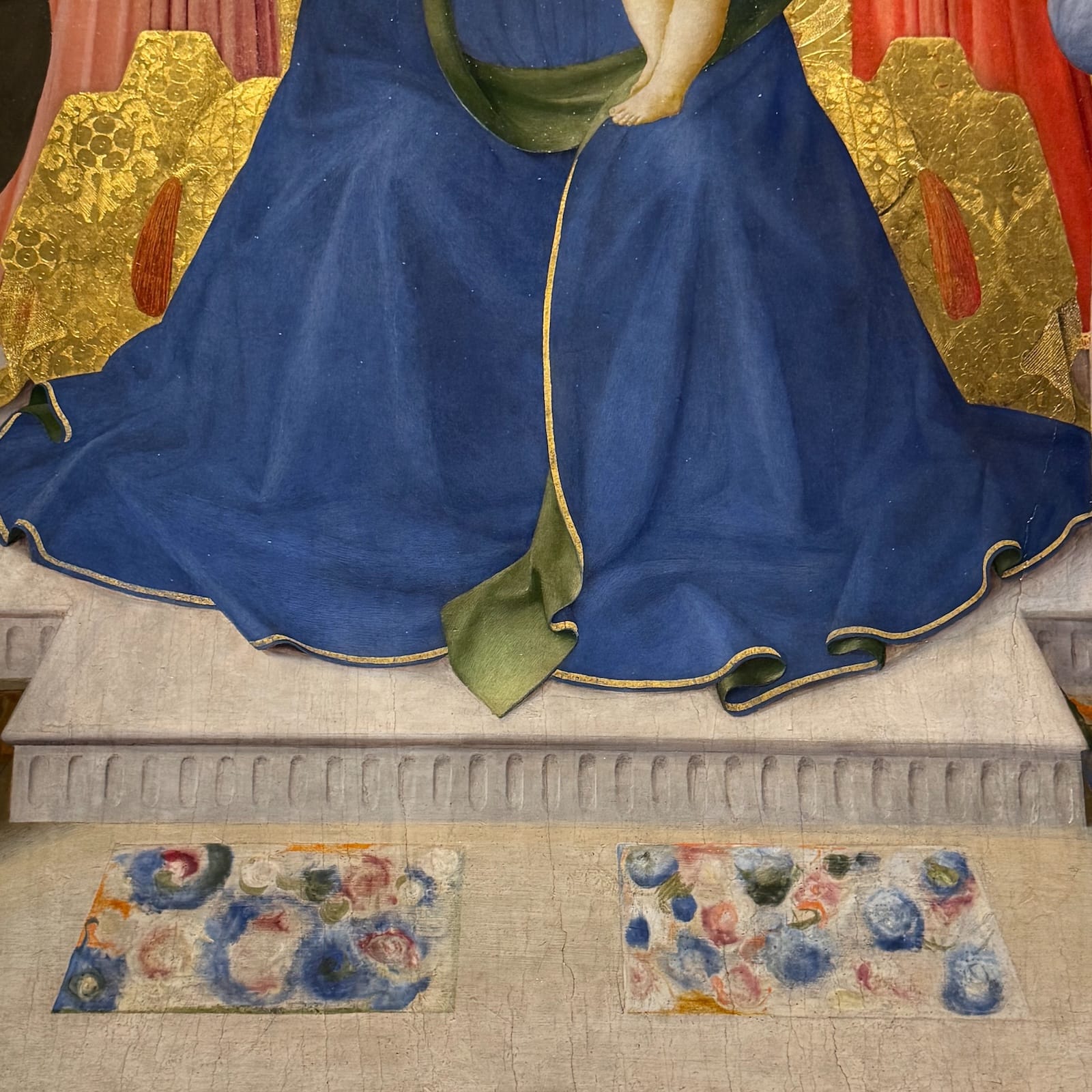 The "Montecarlo Annunciation Altarpiece"’s marble elements support this reading. Similarly, the "Annalena Altarpiece" (1445) abounds with painterly marble: A richly veined amber slab lay beneath the Virgin's flowing robe, with narrow slabs of green and pink marble underneath it. Niches with bright semi-circular pink marble panels float above the heads of the saints. Embedded in that familiar formula of enthroned virgins flanked by saints, Fra Angelico could be nodding to monks and priests in the know about secret mystical meanings of marble and stones.