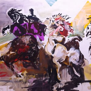 Being Armenian, like most identities, is not one thing but an amalgam of many facets — anyone who tells you otherwise is fooling themselves. That fracture is apparent in the way many of the artists combine disparate imagery in an attempt to make something whole. In “Sasuntsi Davit, Sitting Bull and Buffalo Bill” (1999), Arman Grigorian slaps a mythic Armenian figure alongside a complicated American story of the once heroic Sitting Bull, who ended up surrendering to American forces and joining Buffalo Bill Cody’s Wild West Show. We’re left to wonder if Grigorian is suggesting the Armenian myth has been made into, like the Wild West, some sort of nationalist spectacle. The painting is one of the most dynamic in the show and shies away from the decorative while feeling at once young and energetic.