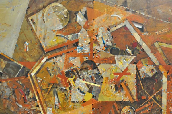 Assadour’s “Armenia’s Earthquake 7/12/88” (1990) is a symphony of earth tones that turn in sharp angles across the surface. Objects and letters are strewn about and the organization of the painting is disorienting. It is easy to lose yourself in the specks of red, orange and yellow, typical of the tufa rock of Armenia. It reminded me of early 20th C. abstraction — as if Albert Gleizes vacationed in the Caucasus.