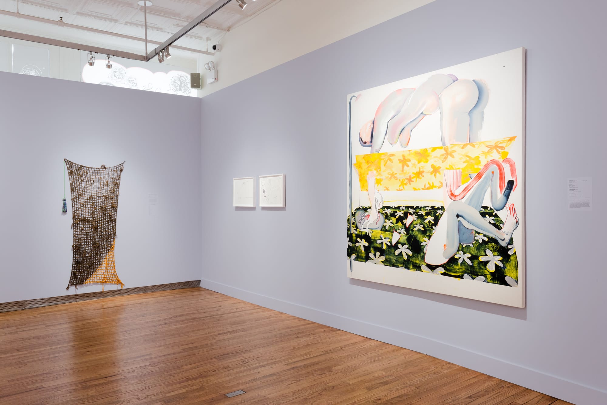 Two works in the show, Angeleno Diedrick Brackens's "waiting on his balcony (self-portrait)" (2013) and New Yorker A.K. Burns’s "She Was Warned" (2017), engage the subject of myth-making, or more specifically, myth remaking. Accented by a tassel on a bright green cord, Brackens's open-knit vertical wall hanging is an irregular grid woven from cotton and acrylic yarn, the threads regularly disintegrating into fibrous tufts. The bottom right portion of the weaving is golden, alluding to the long blonde hair around which the plot of "Rapunzel" revolves; the rest is brown and loosely evocative of natural hair, signifying the artist's recasting of the fairy tale's White cis-het woman protagonist as himself, a Black queer man. Printed on the wall alongside the piece, the 1979 poem “Song for Rapunzel” by Black American gay poet and activist Essex Hemphill asks: “How long must he dream ladders no one climbs?”