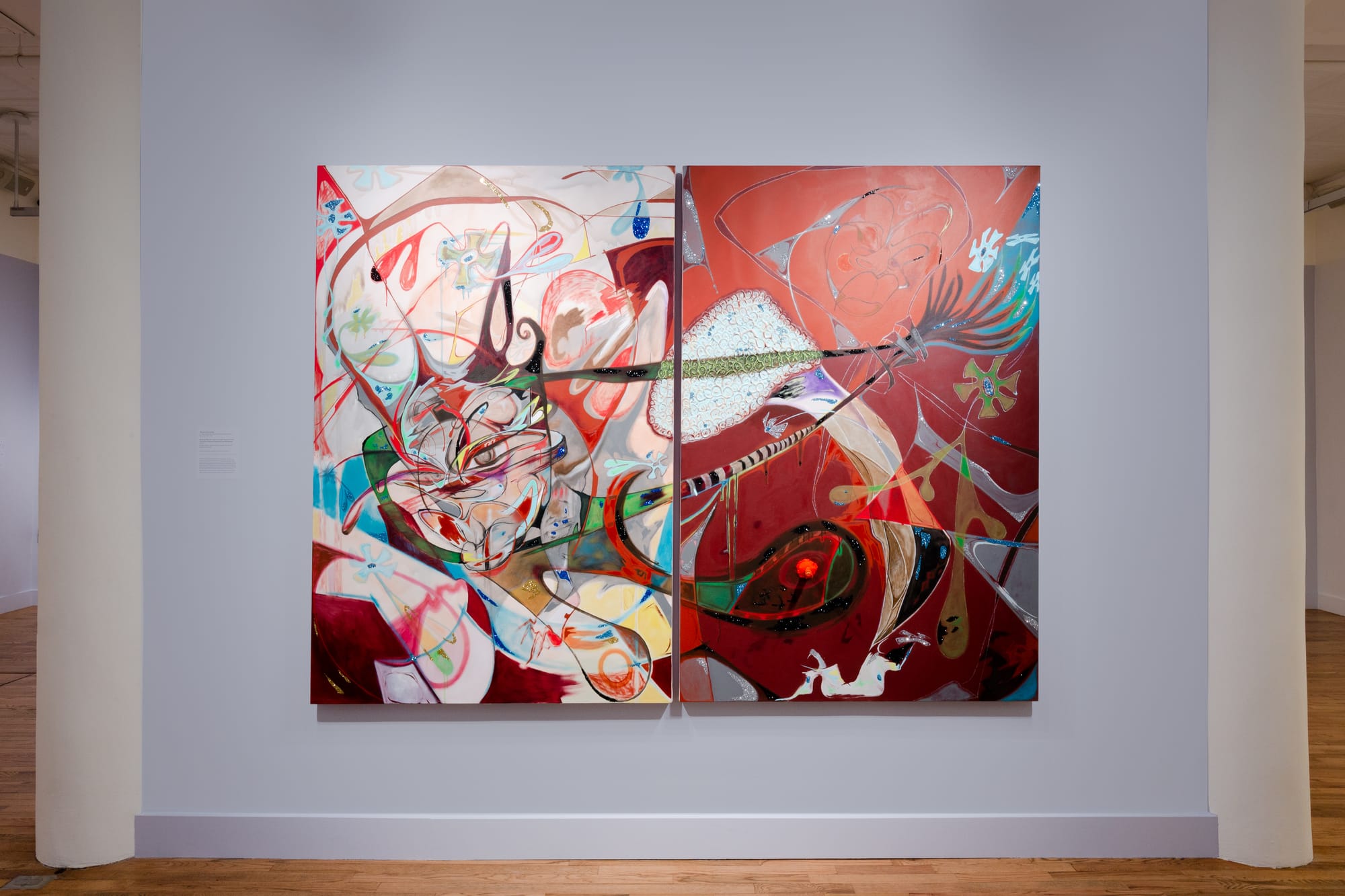 The act of exploding the cramped, foreclosed forms to which bodies and identities are often confined can be effusively generative, to the point of swirling excess. In a large painting by Brooklyn-based artist Theresa Chromati, "Release Me, for I can no longer be your host (Scrotum Flowers Emptying and Merging)" (2022), a cacophony of biomorphic forms and pendulous breasts, punctuated by a small phallic soft sculpture made from red silk and leather, suggest a world in flower. The joy — we could call it jouissance — of visibly breaking from the constraints imposed by normative notions of gender and sexuality is also on display in Los Angeles-based creator Christina Quarles’s "Tig Ol’ Bitties" (2020). With a less pronounced emphasis on sex organs, Quarles's achromatic ink drawing depicts an erotic tangle of predominantly headless, partially clothed bodies (one dons a harlequin print tank top, a sly nod to commedia dell'arte’s agile trickster character). The composition, which is oriented toward the collective, suggests that fragmentation can be simultaneously comforting and disturbing — even painful — for individual ego; a face is both cradled by an arm and smashed by a foot.