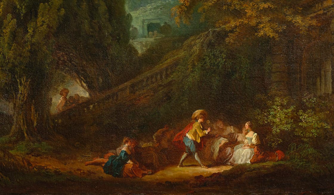 The two compositions depict revelers at play among outdoor ruins set in sprawling bucolic idylls, with great emphasis placed on the landscape. In "La Bascule," partygoers, including a cherubic infant, ride a makeshift seesaw. "Le Jeu de la Palette" portrays a group of youths playing a game in which the winner, who has located a hidden object, smacks the loser with a wooden paddle. The set of paintings belonged to Pierre Jacques Onésyme Bergeret de Grancourt, the Receiver General of Finances in Montauban. An amateur artist himself, the Receiver General was an involved patron who traveled to Italy with Fragonard from 1773 to 1774. In 1786, after Bergeret de Grancourt’s death, the paintings were auctioned off in Paris and subsequently disappeared from the record. Research now indicates that they were purchased by an art dealer and subsequently entered the collection of Nicolas d'Orglandes, a deputy and peer of France.