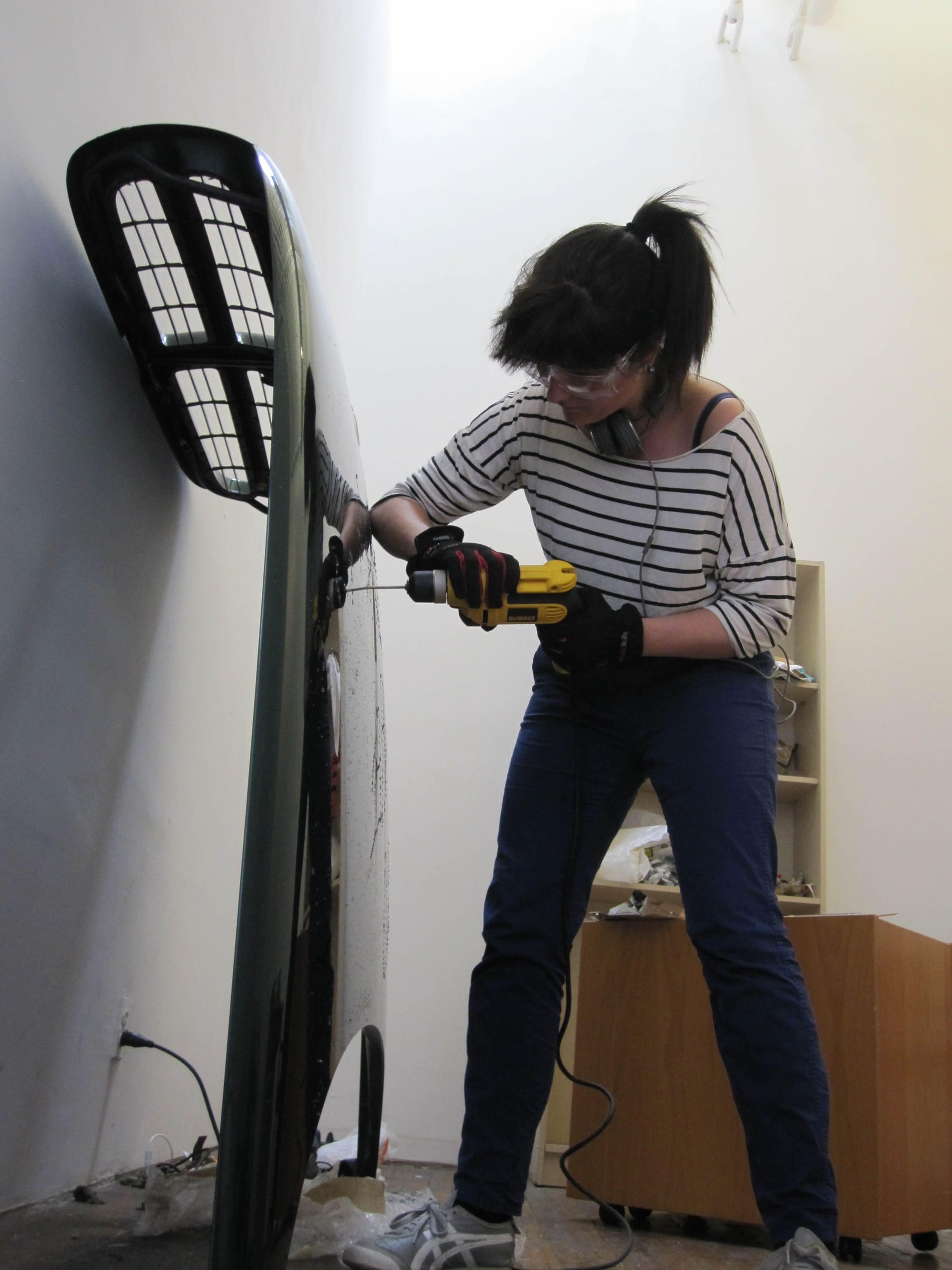 In addition to free advice the drivers finally help the artist source a “classy dodge bonnet with a very nice grill on it,” as she describes it. After her find, she’s begins the process of drilling a series of holes into which she will insert a series of LED lights to illuminate the words.