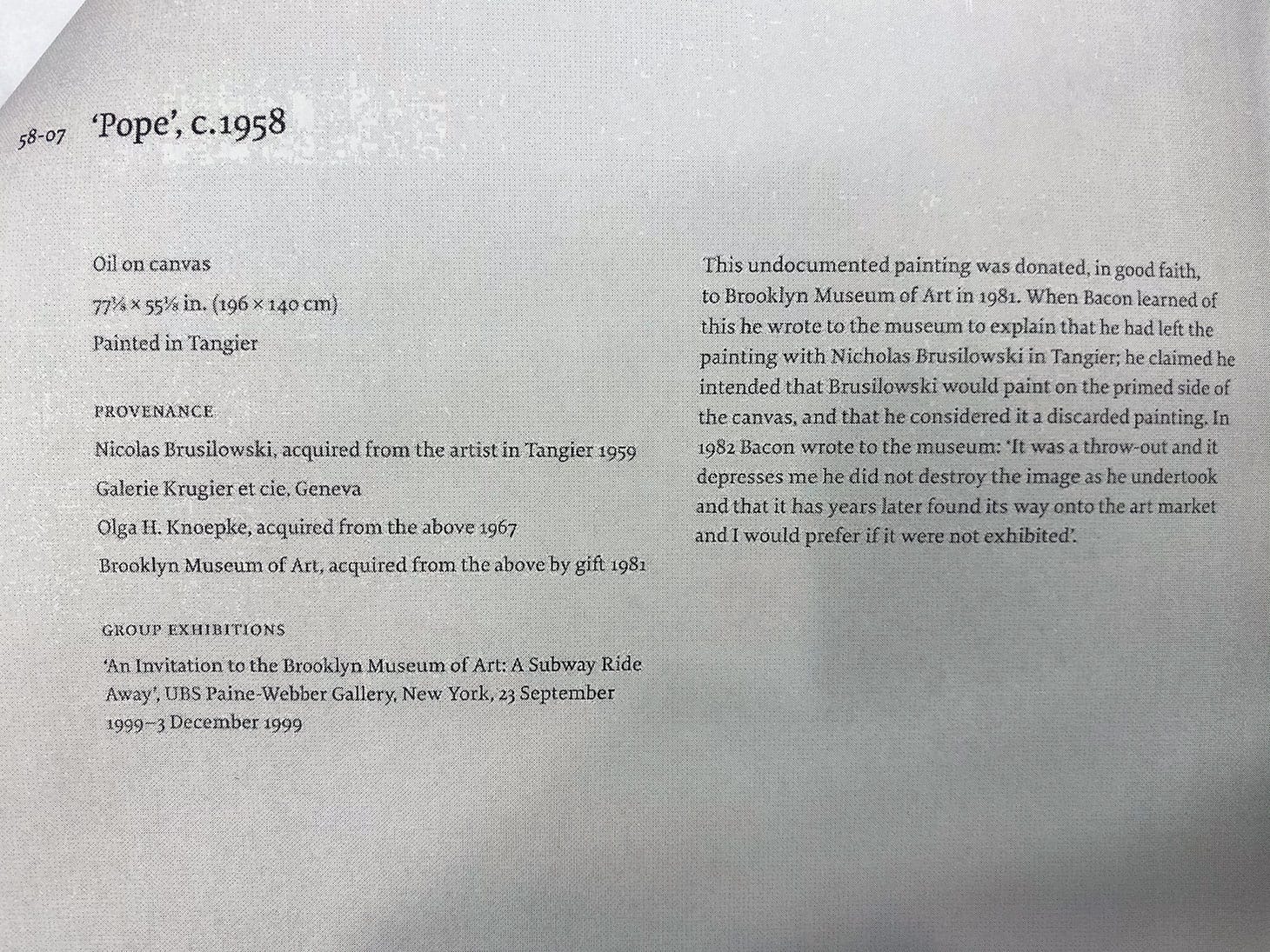 While the museum has exhibited the painting at various times since they received that letter, it was never extensively shown. Most people I’ve asked, even regular Brooklyn Museum-goers, had no idea a Bacon existed in the collection.