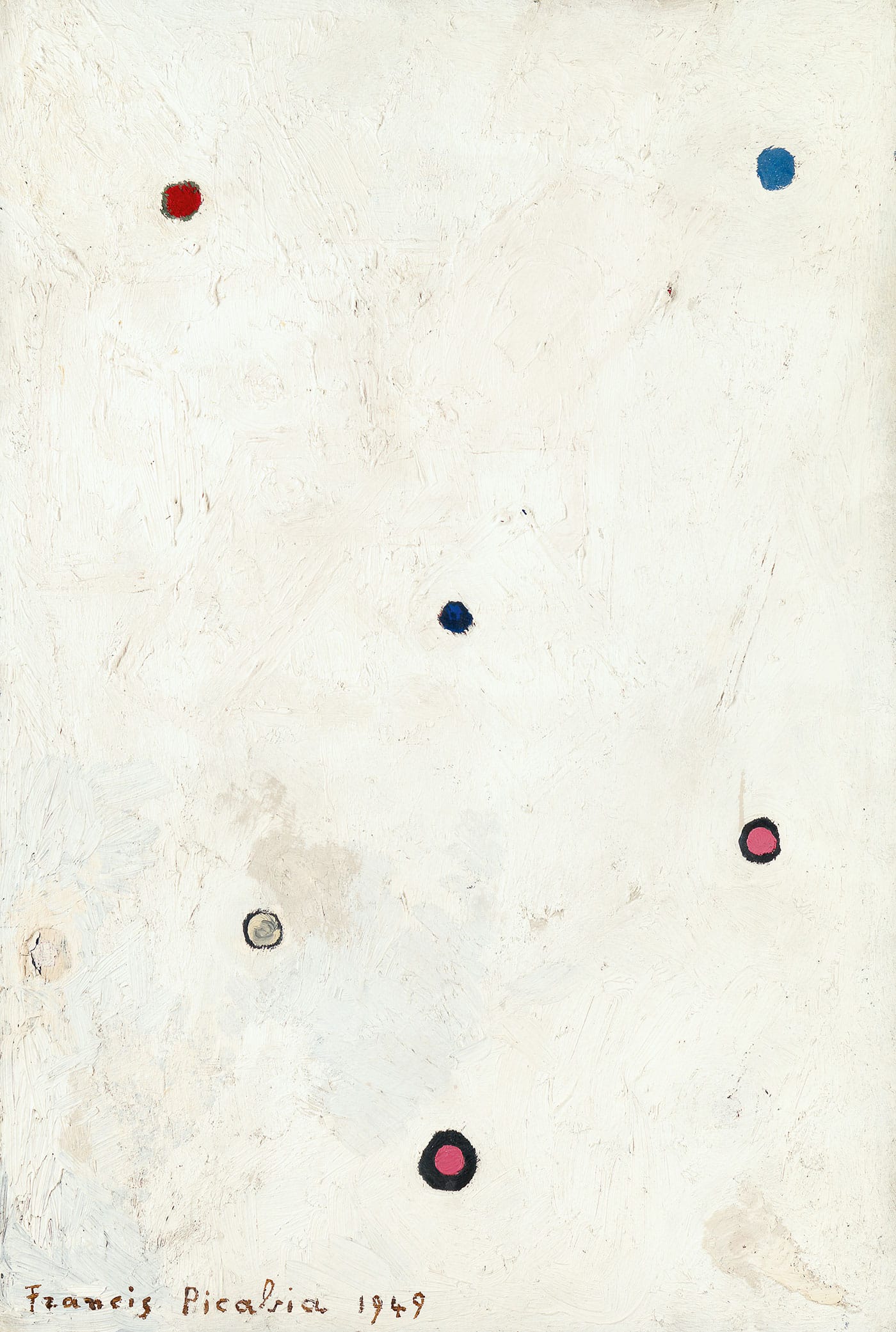 But that is exactly the lesson that viewing Picabia teaches. Meaning in painting isn’t fixed, but contingent and constantly reinvented. Painting is an invitation for viewers to feel complicated emotions, create their own understanding, question their preconceptions, and explore the decisions an artist has made to keep meaning from becoming stagnant and determined. At the end of his life, Picabia switched to biomorphic abstraction and then finished by painting dots on colored fields. Never relinquishing his desire for change, Picabia created work that, in its unfathomablenesss, forces viewers to confront the mechanisms of ambivalence and confusion that lie at the heart of our confrontations with the world.