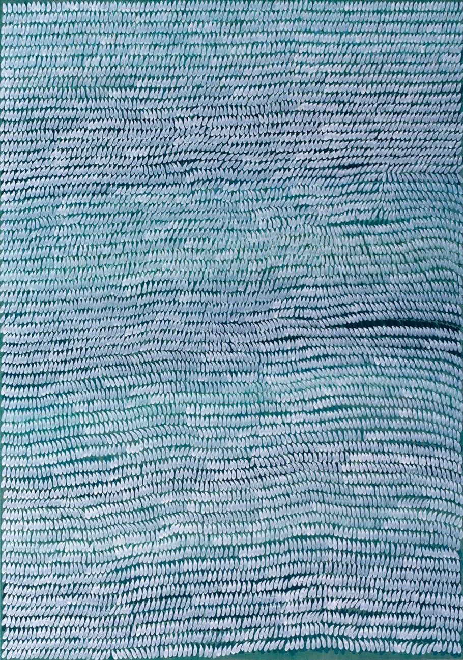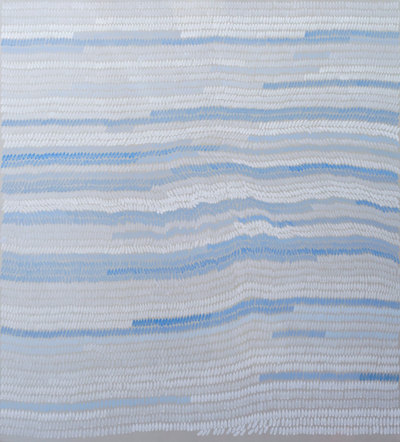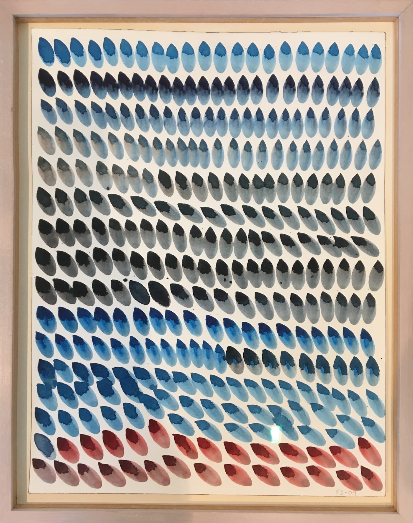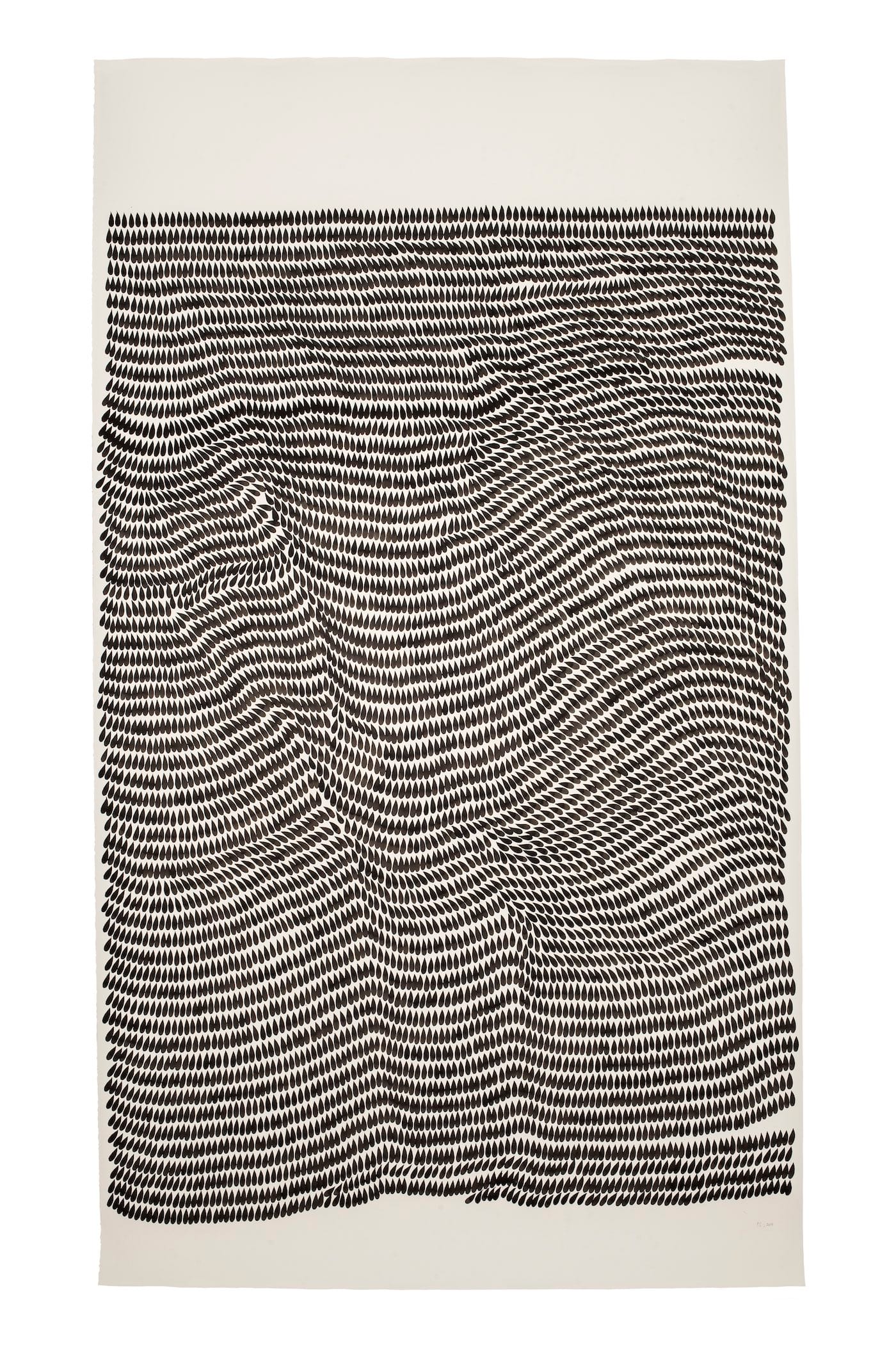 That act was to touch a loaded brush to a vertical sheet of paper or canvas, making a row of imprints resembling a teardrop or raindrop, one after another, row after row, until the surface was filled. The rows were not uniformly perfect, as the forms sometimes tilted to the left or right, affecting the placement of the teardrop next to it. When she worked on a white surface, she used black paint or ink. For a black surface, she used a white medium.