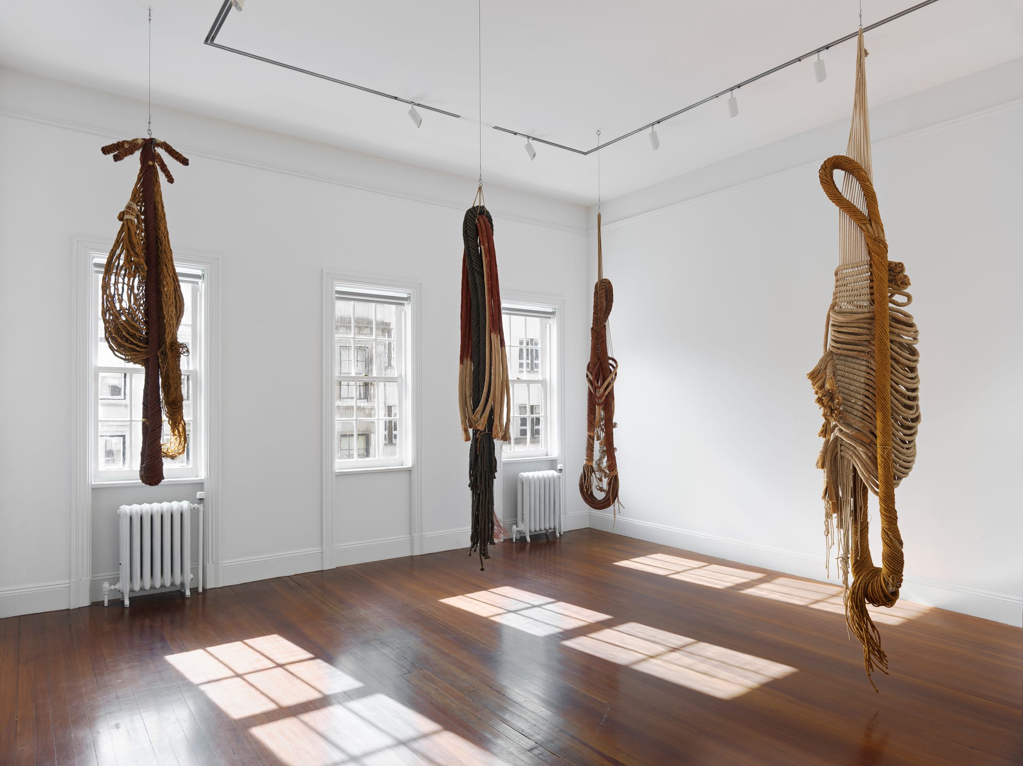 Comparatively small at 36 ½ inches long, the two-part “Salt Fish” is a clever example of the sculptural possibilities of rope and plaster: For the “body,” lengths of honey-colored rope are loosely braided and lightly coated with off-white plaster; the “skin” is a flat plaster cast imprinted with the pattern of the braid. (The conceptual counterpart to “Salt Fish” is “Interpolations XXI” (1982), made from muslin buff pads and evoking scales or a spine.) In another room, four stunning sculptures, hung from the ceiling in a loose arrangement, at times catching the light from the windows, are like artifacts of a lost civilization.