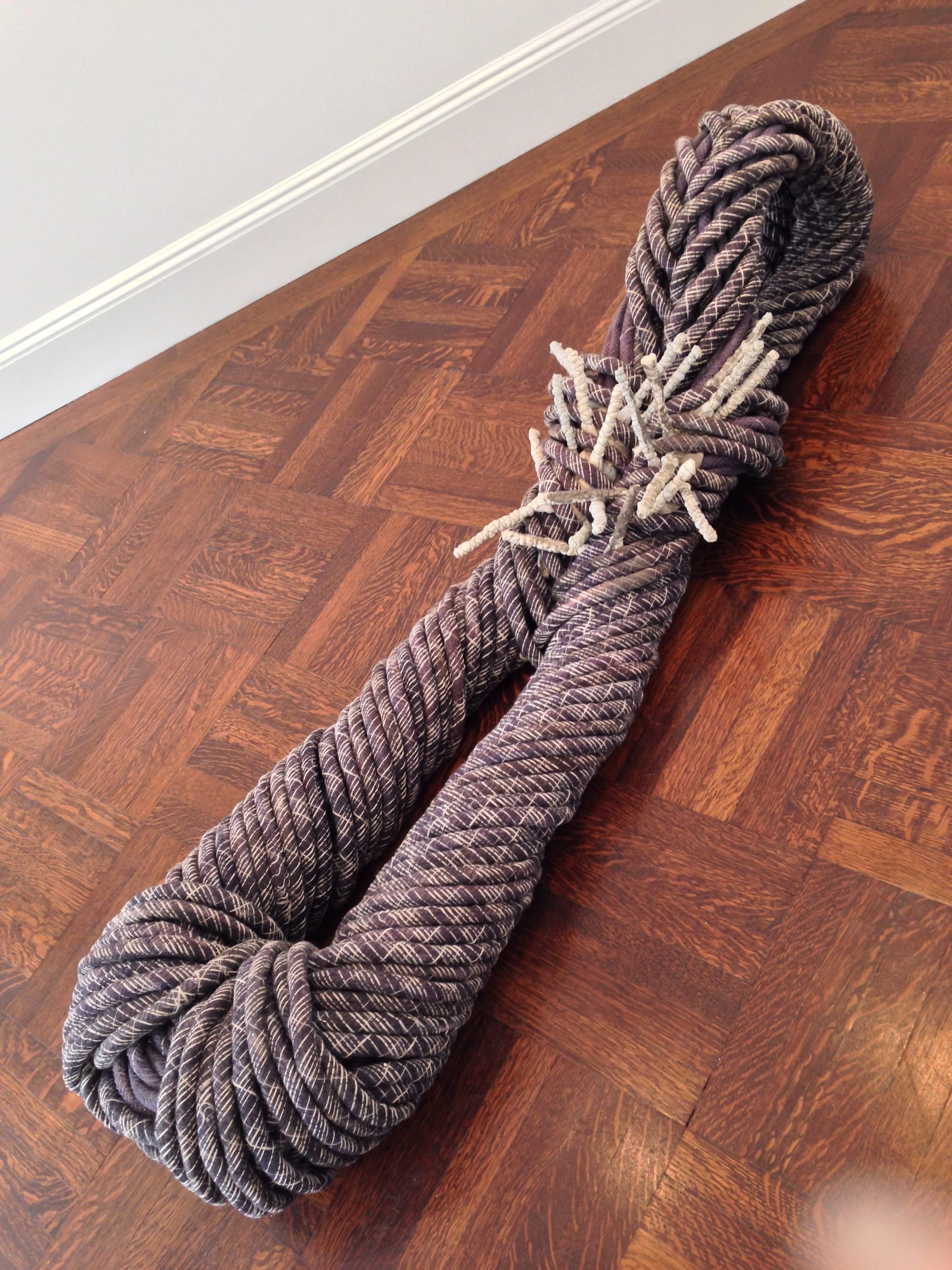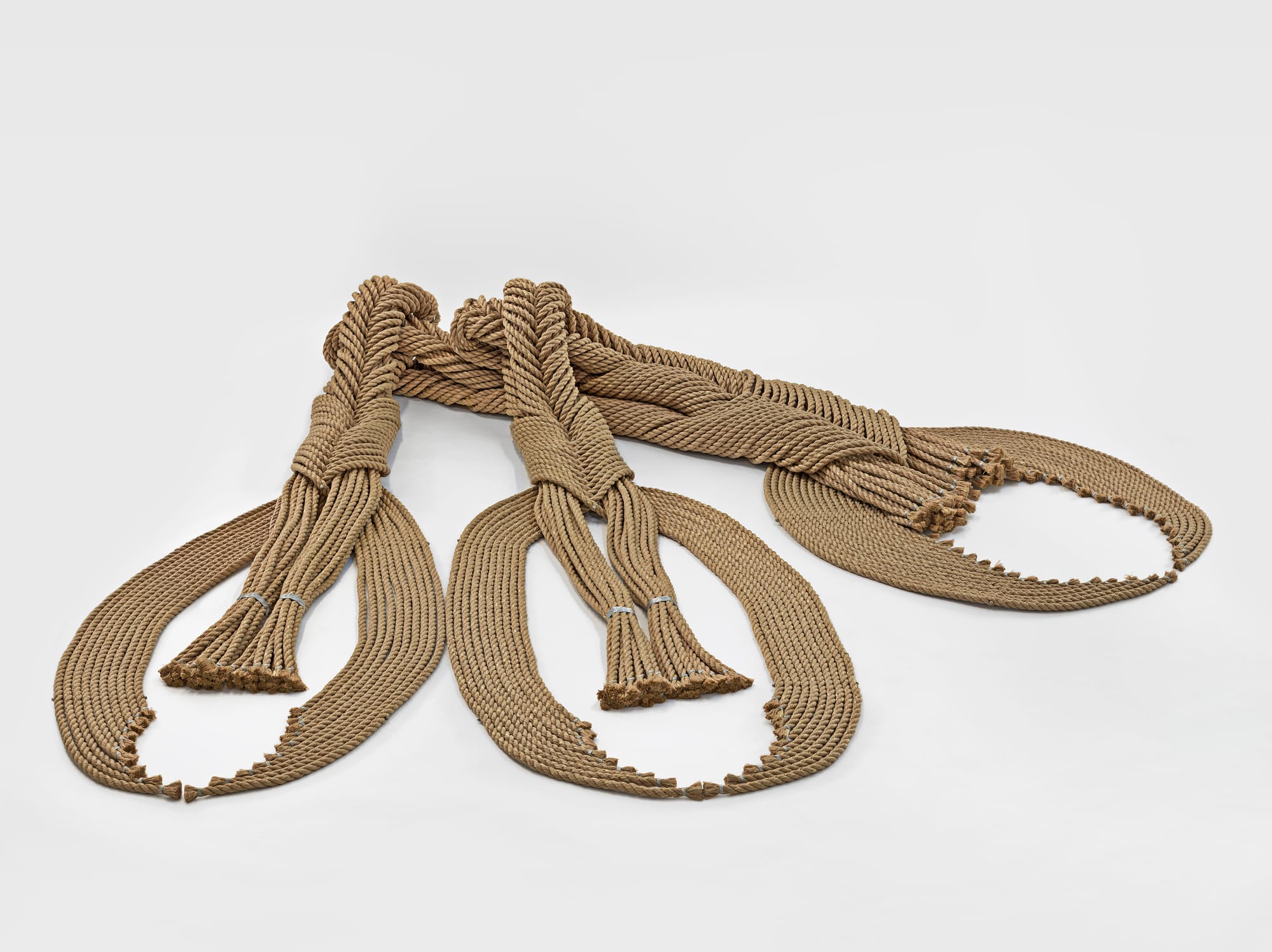 She also identifies interpretive dance, with its use of horizontal as well as vertical planes, as an inspiration for her work. The inspiration is visible in the way her rope both defies and conforms to gravity, sometimes appearing to crush form upon form, other times to support itself with its own weight. In “Embryo” (1987), a combination of Manila and cotton rope, tied at the ends with blue thread, is partially wrapped in plastic, folded over and bound with intricate knots. From the side, it suggests a body doubled over on itself or a child and adult embracing.