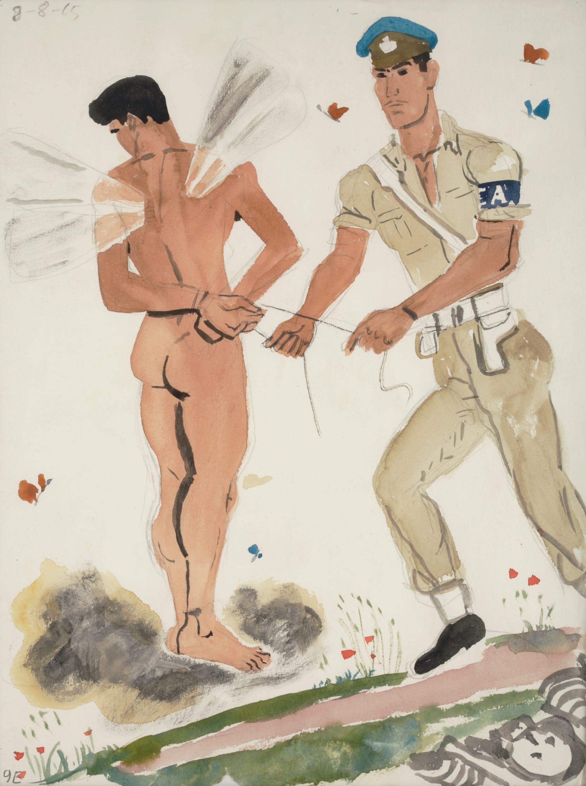 Tsarouchis fought in the Greek military during the Greek-Italian war, and perhaps unsurprisingly explored taboos surrounding gay men in uniform. In his oneiric watercolor, “The Study for the Beach” (1962), bathers in various stages of undress linger in the shade of a large rock. The gleaming contrast of one man’s pristine white uniform against the vulnerable pink flesh of the others, brings to mind Susan Sontag’s essay, “Fascinating Fascism,” on sadomasochism and the complex role that fascist uniforms and aesthetics play in fetishistic fantasies.