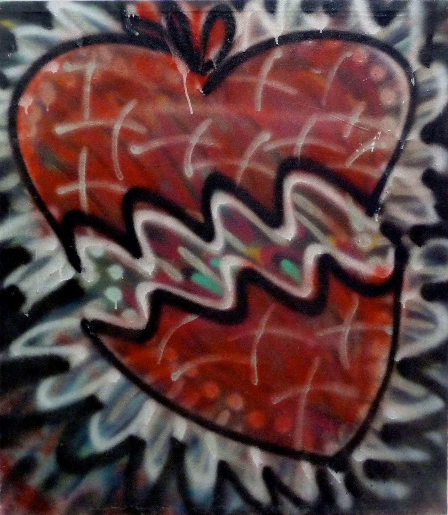 Hearts are combined with more personal and private motifs — an iron, a fighting couple, the Goodyear blimp, and a Picasso-like Guenica horse — in his famous mural (one of dozens Romero painted throughout the city) “Going to the Olympics” (2011). And often, his art turns almost into a kind of fetishism with beautifully created objects focused on the automobile, a chair, a gun, a cactus plant, or through events such as a trip with a dog in a car.