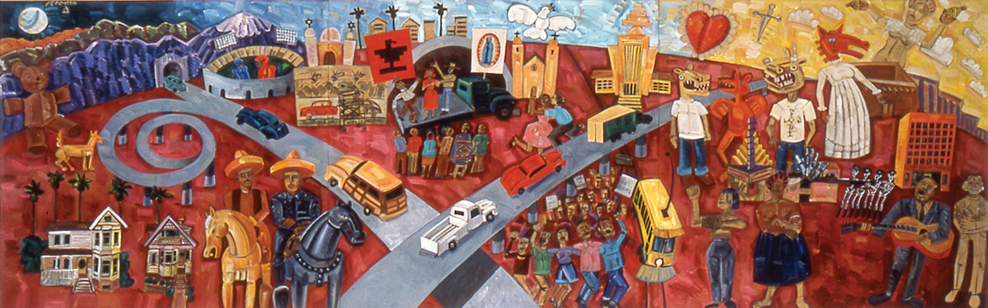 Even more importantly, through large murals and evocative paintings, Romero traced the history of Chicano life throughout the city. Particularly in works such as “The Death of Rubén Salazar” (1986), “The Closing of Whittier Boulevard” (1984), and the more comical, certainly ironic, “The Arrest of the Paleteros” (1996), the artist writ large the tragedies and absurdities of being an American of Mexican heritage in the vast LA metropolis.