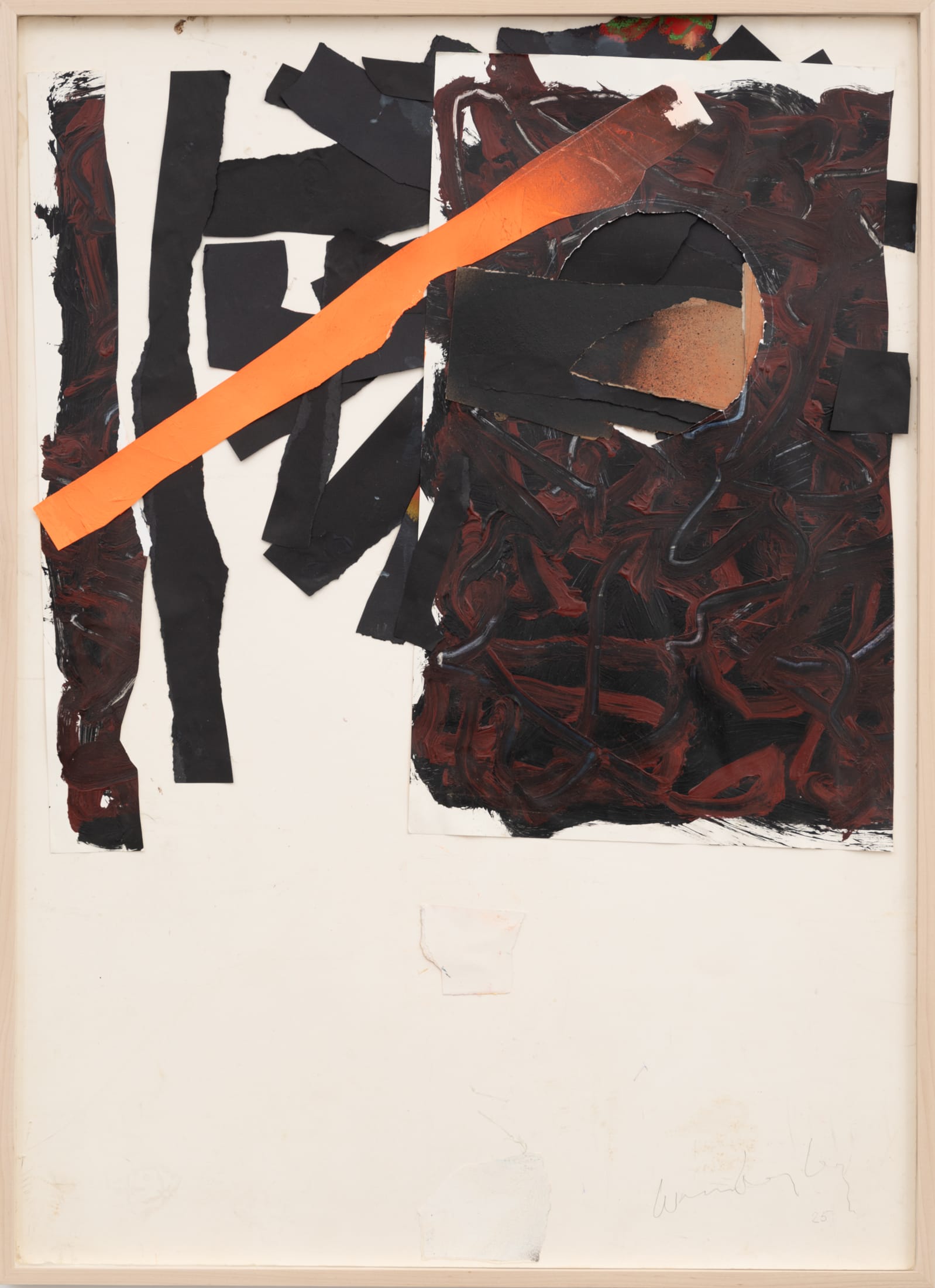 Last winter, from his home in Corona, Queens, then-98-year-old artist Frank Wimberley puzzled together a collage. The resulting work is an amalgamation of shorn paper laid upon museum board. Some of those sheets are layered with thick, textured acrylic brush strokes in moody shades; a bright streak of orange passes through the composition, while a circular portal grounds it. Soon after completion, “Untitled” (2025) went on view in Frank Wimberley: Before More After Less at Berry Campbell Gallery in Chelsea, showcasing his paintings, collages, and sculptures spanning 1982 to 2025. The collage was, in the words of his wife, Juanita Wimberley, “the first one to go.” Before More After Less marked a milestone for the artist: a retrospective look at decades of artmaking. “I was looking at work that I had done over the years,” he reflected in an interview with me in February. “It's like looking at your life.”