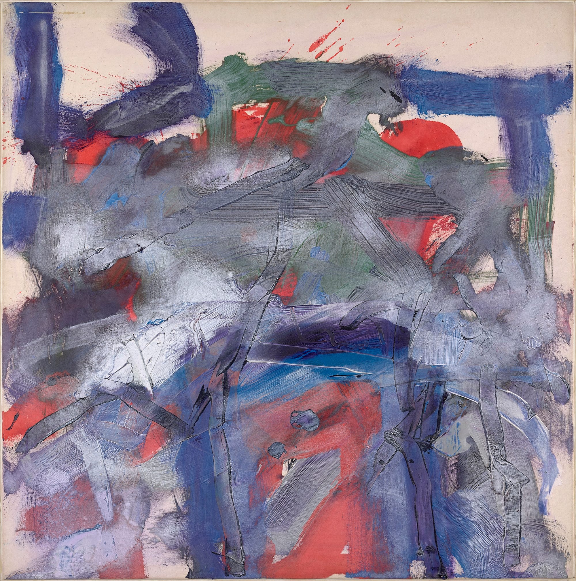 Jazz remained a major influence for the artist. Painting and music were symbiotic, feeding off one another in their mutual devotion to emotion and intangibility, to free expression. He smeared, streaked, and blended paints using floppy brushes, wire, and pumice stone, working with acrylic paint for its rapid-drying quality — he worked quickly, finishing each work within 24 hours, a nod to the rapid improvisation of jazz. “I wanted to get to a solution as soon as possible, perhaps that night or the next morning,” he explained. He was also a sculptor, and sometimes included surfeit sawdust from his woodworking into his paint to enrich its texture on the linen canvases.