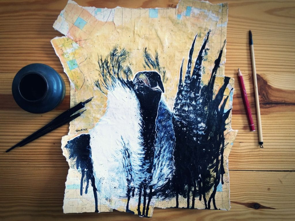 In Nick Thornburg's "Reclamation," an ink and acrylic rendering of a sage-grouse over a topographical map of priority conservation areas in central Wyoming celebrates the species' proliferation under new protection efforts. (image courtesy Nick Thornburg)