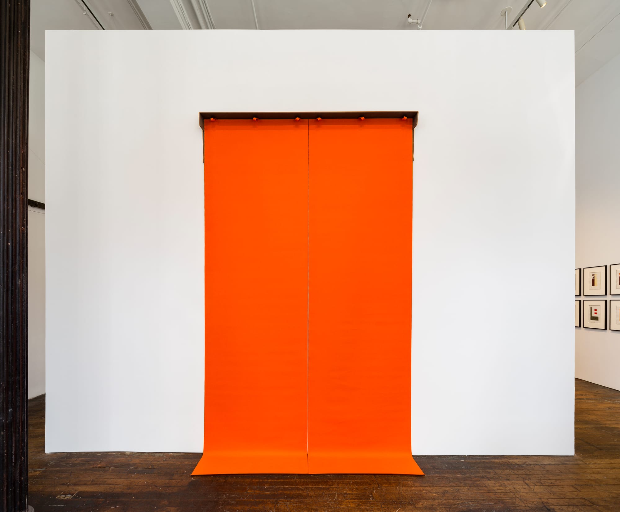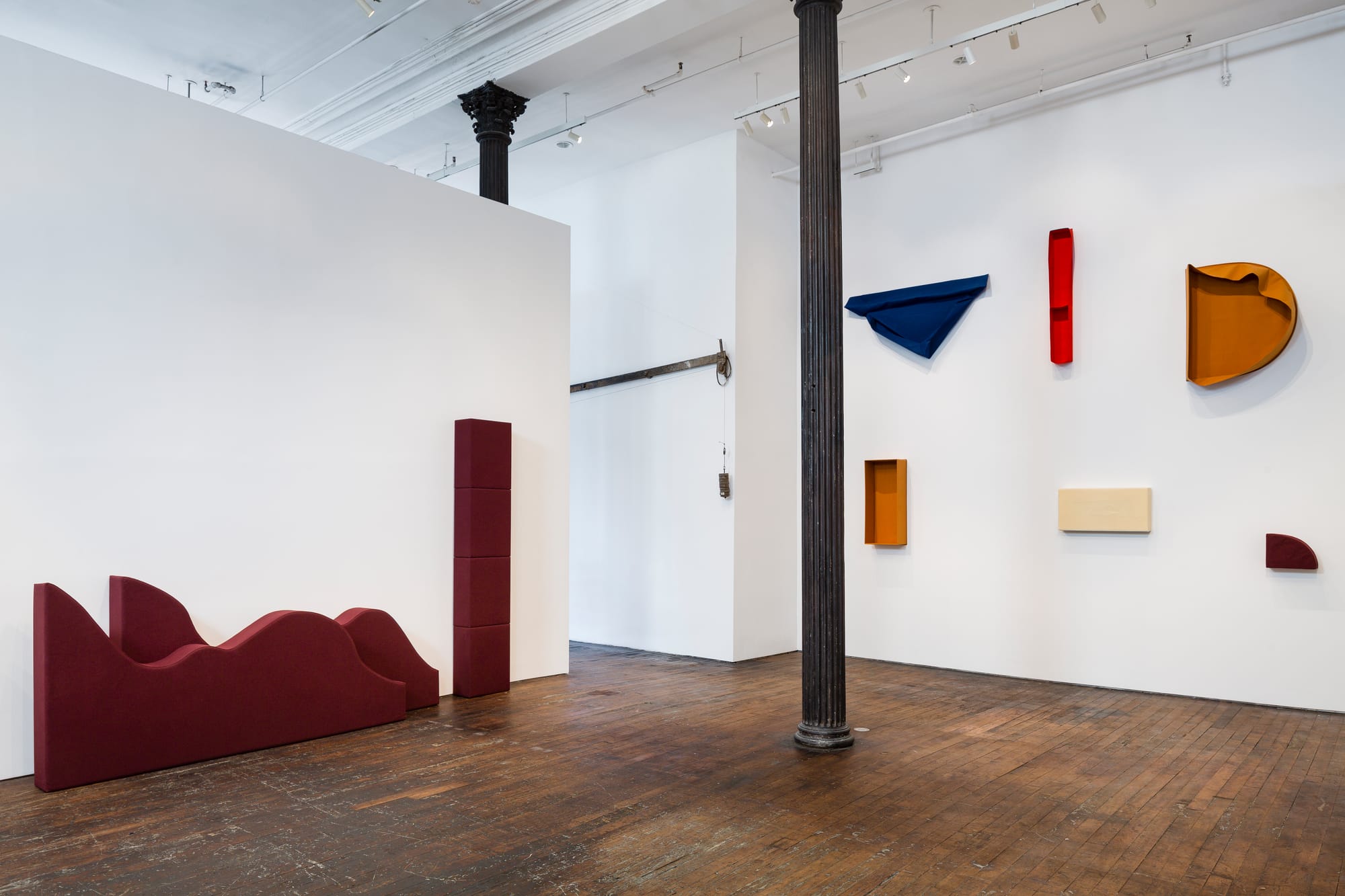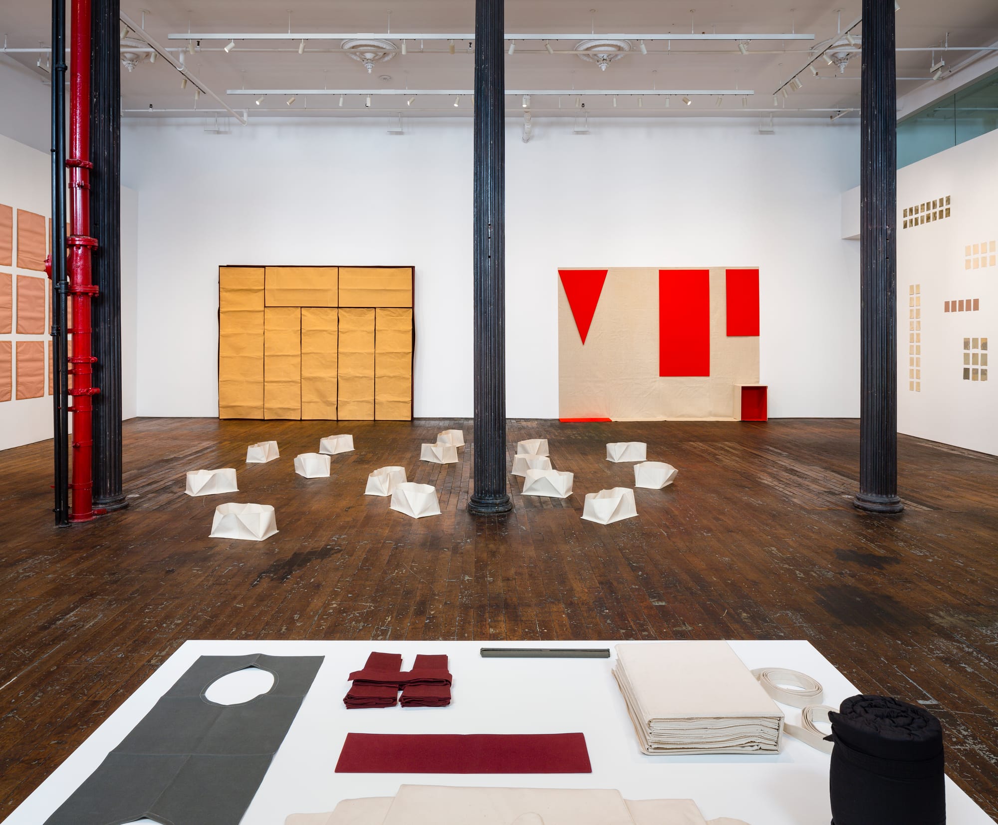 The second room juxtaposes works on paper with sculptures spanning Walther’s career. These feature seven elements from the emblematic “First Work Set” (1963–69): 58 monochrome items made of heavy cotton sailcloth. Possible modes of display include: folded inside a cotton cover, placed over the cover, installed in vitrines or on pedestals, laid on the floor, worn, pressed, or anything else that could be considered an “activation,” according to Walther’s definition.