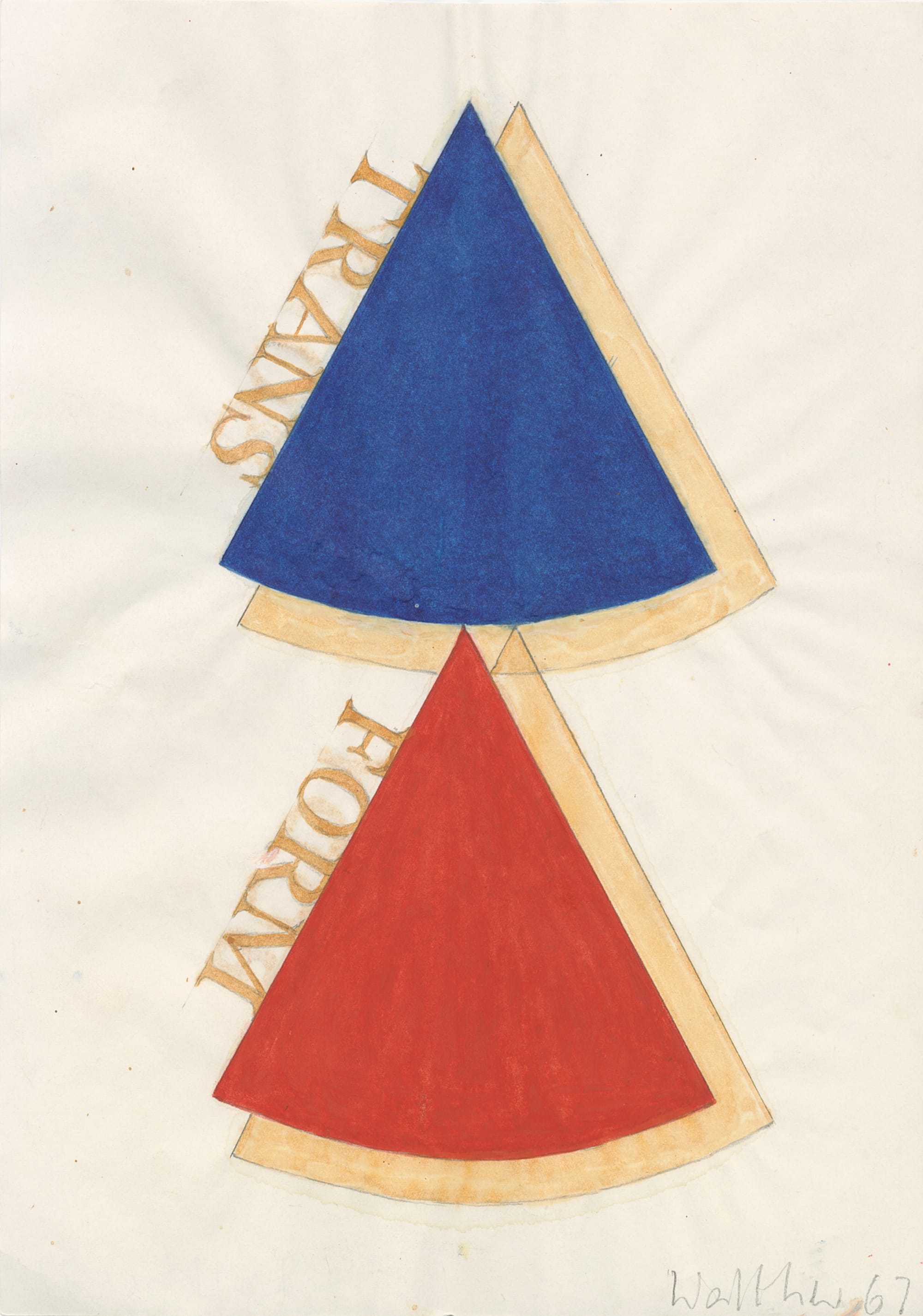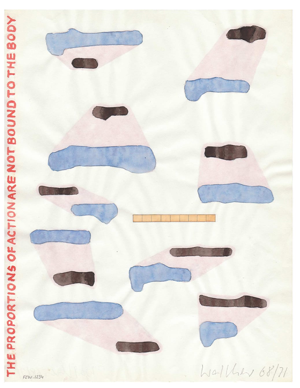 As a student in the College of Art and Design in Frankfurt, Walther developed more than 200 “Word Pictures” (1958), monochrome words painted in gouache on paper that point to the participatory nature of words: “I was walking in school … and I found a class about lettering. Not handwriting, not calligraphy, but constructing letters; for me it was some kind of architecture. It was fascinating!” With this series, he developed a strategy he still uses today of drawings words as well as concepts related to each word that show what you can develop with these tools: new experiences, ideas, conceptions. During our conversation, he used the word “tempo” as an example, explaining, “The spectator should develop this term to imagine that also means taking part. … When you develop the term you take part in the work. It is not only reception but participation.”