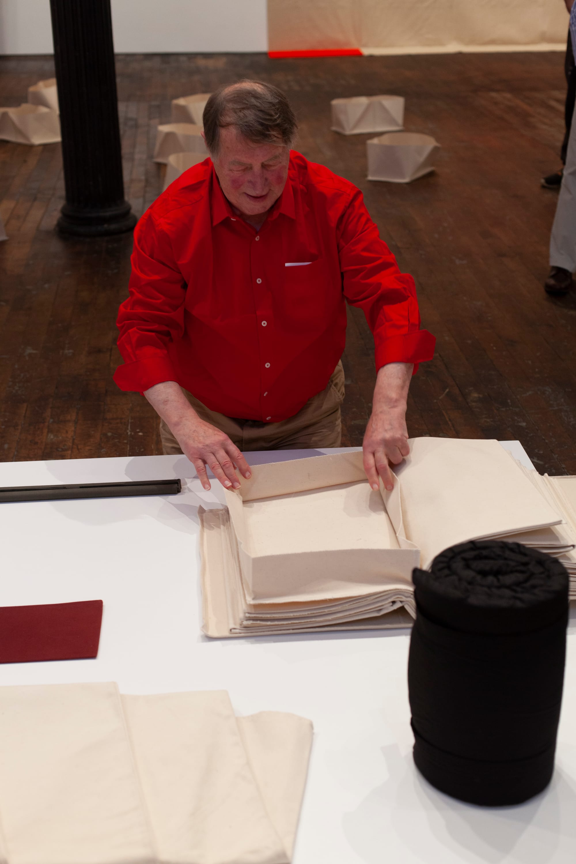 In a conversation with Walther, he explained that over the years the titles of the elements have changed based on their reception at the time. The titles were intended sometimes as a game and sometimes a description, but they were never meant as interpretations. For example, “No.22” in the First Work Set was originally called “Piece to drop” (1969), then “Case piece” (1974), and, finally, “Falling Piece 2 x 15” (1991). Although you can’t touch the works in this exhibition because of conservation reasons, Walther activated his malleable sculptures during the opening by using his whole body to press, fold, and unfold them. When I asked him which was his favorite form of activation, he answered, “I prefer improvisation.”