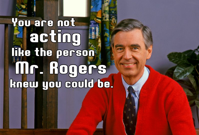 These myths about Rogers seem derived from the same impulse that drives us to canonize him. In troubled times, societies seek out heroes, whether storied individuals from the past or icons of inspiration from the present. We look to saints for guidance; not necessarily religious figures, but people whose lives offer a way forward in the darkness and a framework for righteous, proper living. But once a culture designates something as sacred, it generates an opposing reaction, a need to make that sacred thing profane, to defile what we’ve been told is holy. Maybe ours is just a society starved for love, but in some ways it seems like a fundamental distrust of goodness in human beings. Mister Rogers can’t just be a nice man. He either has to be a divine being sent from Heaven to preach a message of harmony on viewer-supported television, or he has to be the American Sniper, covered in tattoos and beating up Mormon missionaries in back alleys.