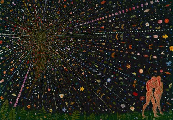 What jumps to mind after the initial visual amusement is Tomaselli’s engagement with art history. The density of the paintings aren’t simply that they’re obsessively made from print scraps, but also that the works carry layers of visual and conceptual references. Take Tomasell’s “Untitled (Expulsion)” from 2000 (seen above). The image is an expulsion from Eden, the banishment of Adam and Eve, and shows the clear influence of a Masaccio fresco in Brancacci Chapel. The appropriated pose of the figures and belies the surreal nature of the rest of the work, but yet the classical and the bizarre are together subsumed into a greater whole. The angel of Masaccio’s depiction is replaced by an epic, swirling representation of something both divine and horrible. A central eye (another fixation of Tomaselli’s) tops an amorphous body of resin-encased leaves, radiating outwards in a dazzling of insects, flowers, body parts: the natural world. Wouldn’t you imagine the force casting you out of Paradise to be terrible and terrifying?