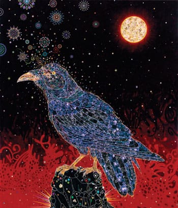 Tomaselli updates an old archetype in a new vocabulary, and blows up the imagery of Eden with the force of a hallucinogenic. Also check out Tomaselli’s “Big Raven” (2008), a massive bird perched atop a stone that seems to explode into particulate snowflakes. The black background of the piece separates from its subject like a dissection board. Yet as phantasmagorical as the work looks, it has clear visual precedents. Check it out next to James Audubon’s naturalist bird paintings. In context, the underlying weirdness of Audubon’s work comes out just as the probing, scientific quality is uncovered in Tomaselli’s work.