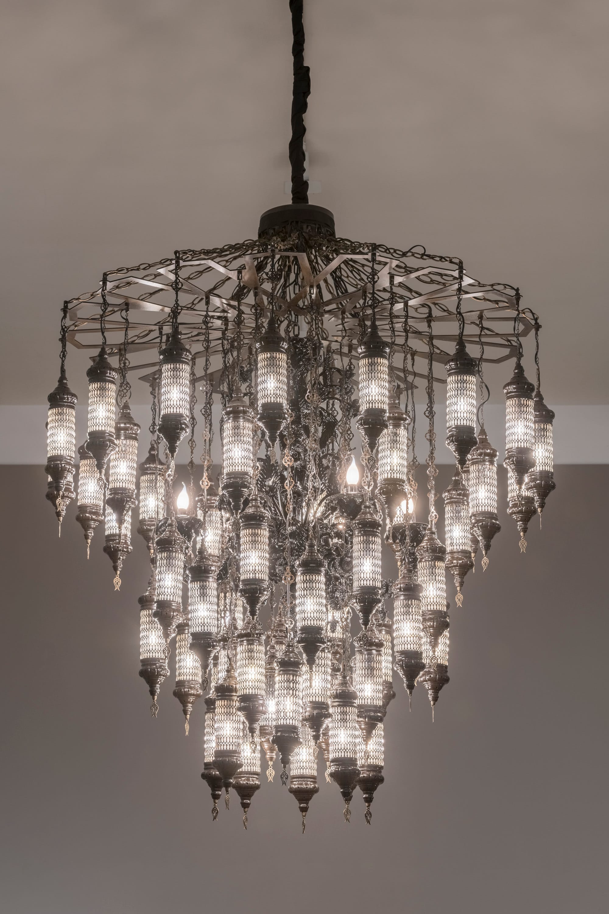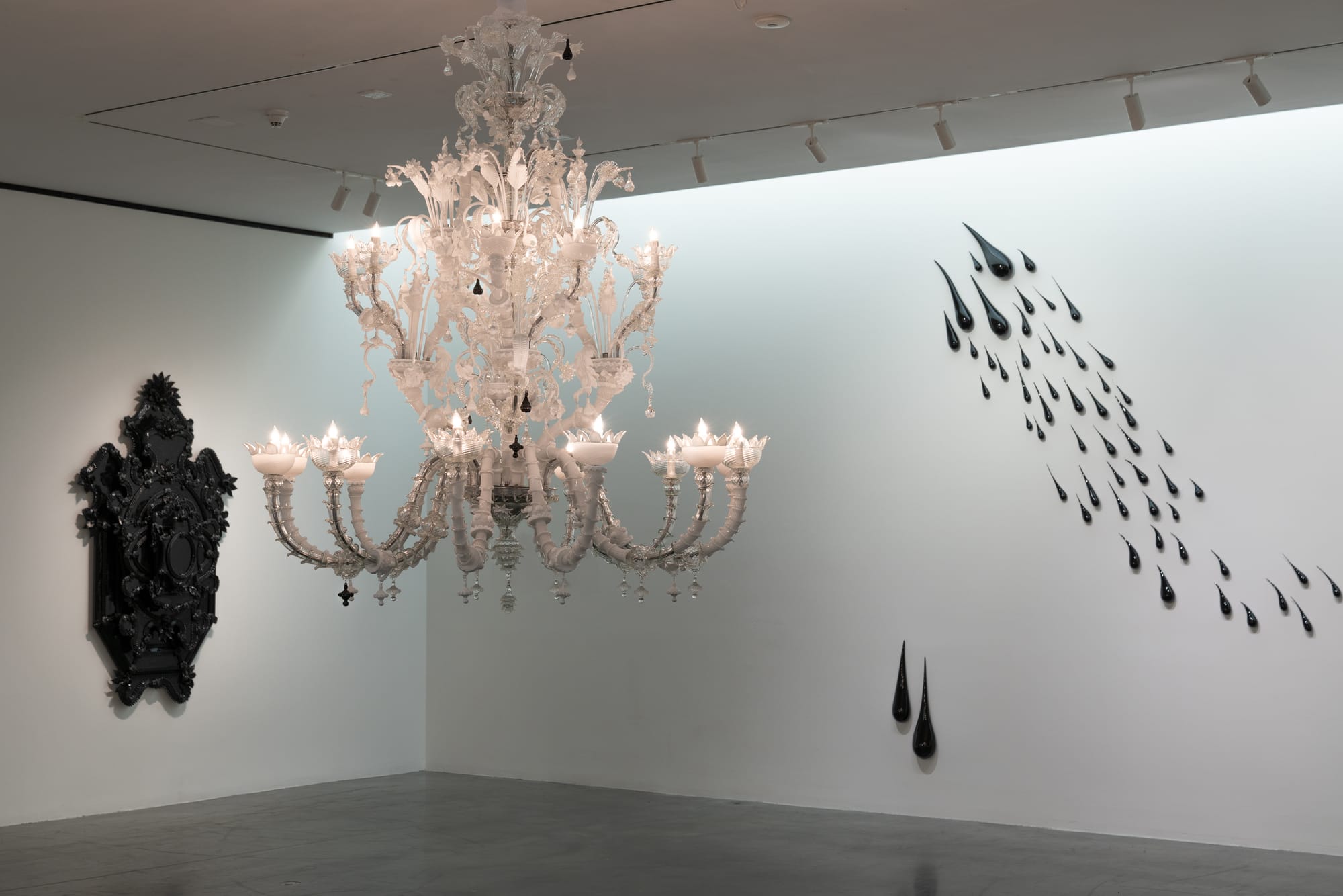 Afro Kismet additionally features Wilson’s work with Murano glassmakers in Venice, which, like Iznik ceramics, is a prestigious, 500-year-old tradition. These are gorgeous objects: sculptural mirrors with a deeply opaque yet ultra-glossy black surface and enormous black chandeliers combining Venetian and Ottoman decorative elements. (One exception is “A Moth of Peace,” 2018, a gleaming, white chandelier with a half-dozen component parts cast in black scattered within it.) The mirrors and “A Moth of Peace” are given their own room at Pace, along with three wall installations of sensuous, black, blown-glass teardrops or raindrops or oil drops or sperm cells (more are in the main room).