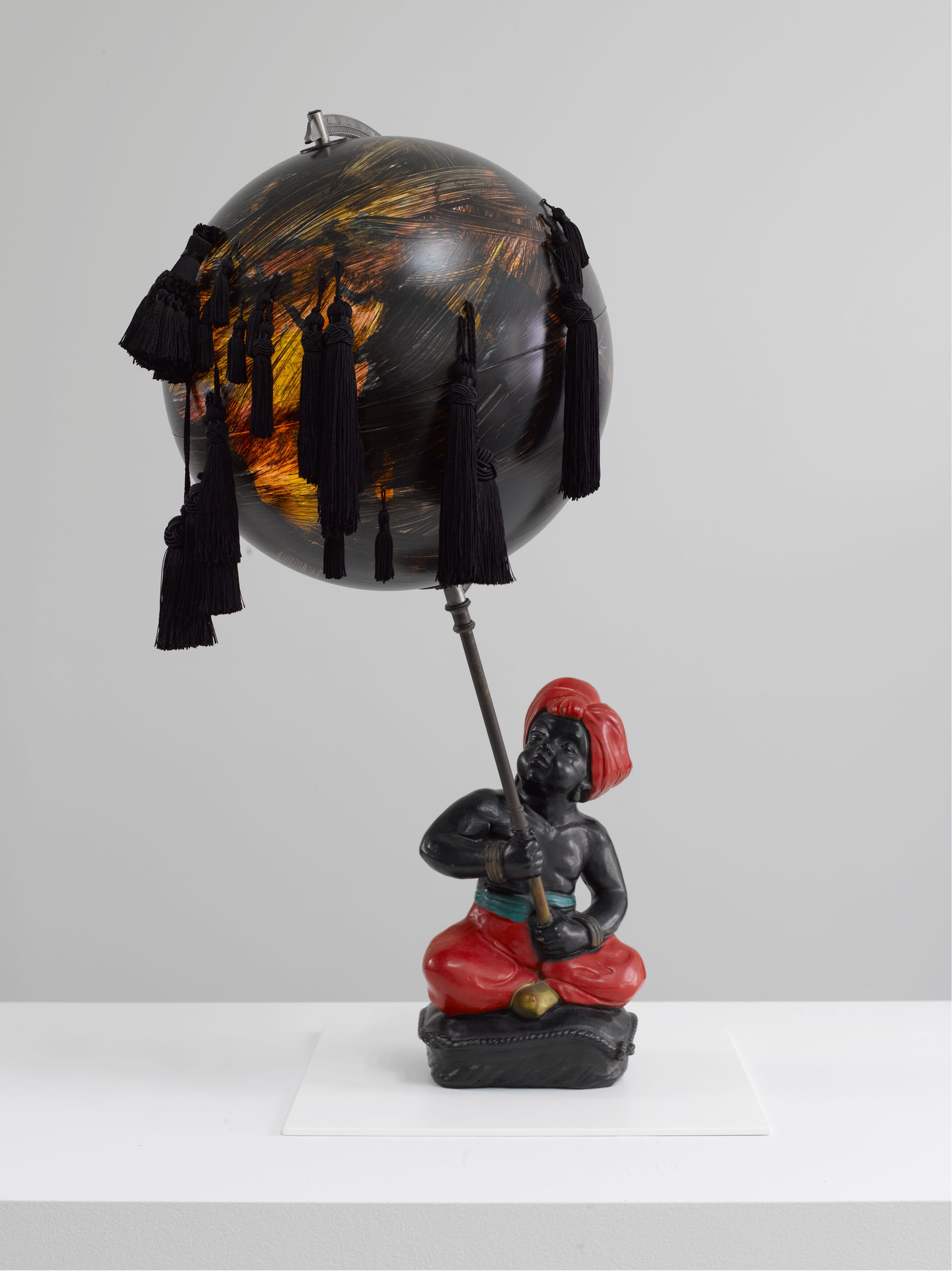 Throughout Afro Kismet, Wilson embeds his emphasis on blackness within a wide-ranging set of social and economic interactions, perhaps most literally with two world globes on which he has painted dark swooshes, obscuring the boundaries of countries and continents, and capturing the whirlwind that was globalization during the early modern period — for better or for worse: in the former case, for wealthy merchants (and artists) in Venice and Antwerp; in the latter, for parts of Africa. One of these globes, covered in black tassels (“Untitled (Zadib, Sokoto, Tokolor, Samori, Veneto, Zanzibar, Dhaka, Macao),” 2011), is held aloft on a stick by a turbaned blackamoor figure. The other, “Trade Winds” (2017), rests on a pedestal at the back of the gallery, serving as another of Wilson’s career-long appropriations of everyday objects that aims to convey a much larger history, one usually forgotten, suppressed, or untold.