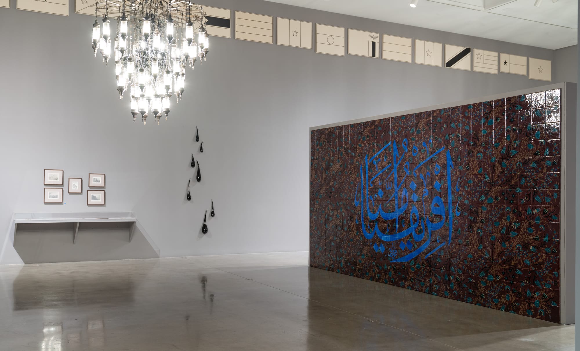 In his groundbreaking and landmark “Mining the Museum” exhibition at the Maryland Historical Society in 1992, Wilson famously reinserted a previously suppressed history of African American slavery by pulling from that institution’s archival storage objects such as slave manacles and putting them on display. For the 2003 Venice Biennale, he collected blackamoor statues — the European version of lawn jockeys in the United States — from around Venice and put them in the U.S. pavilion. In Istanbul and at Pace, he extends this gaze to Arab culture, most dramatically with Mother Africa (2017) and Black is Beautiful (2017), both large (9 by 19-foot) freestanding walls consisting of Iznik tiles that Wilson produced collaboratively with a workshop in Turkey.