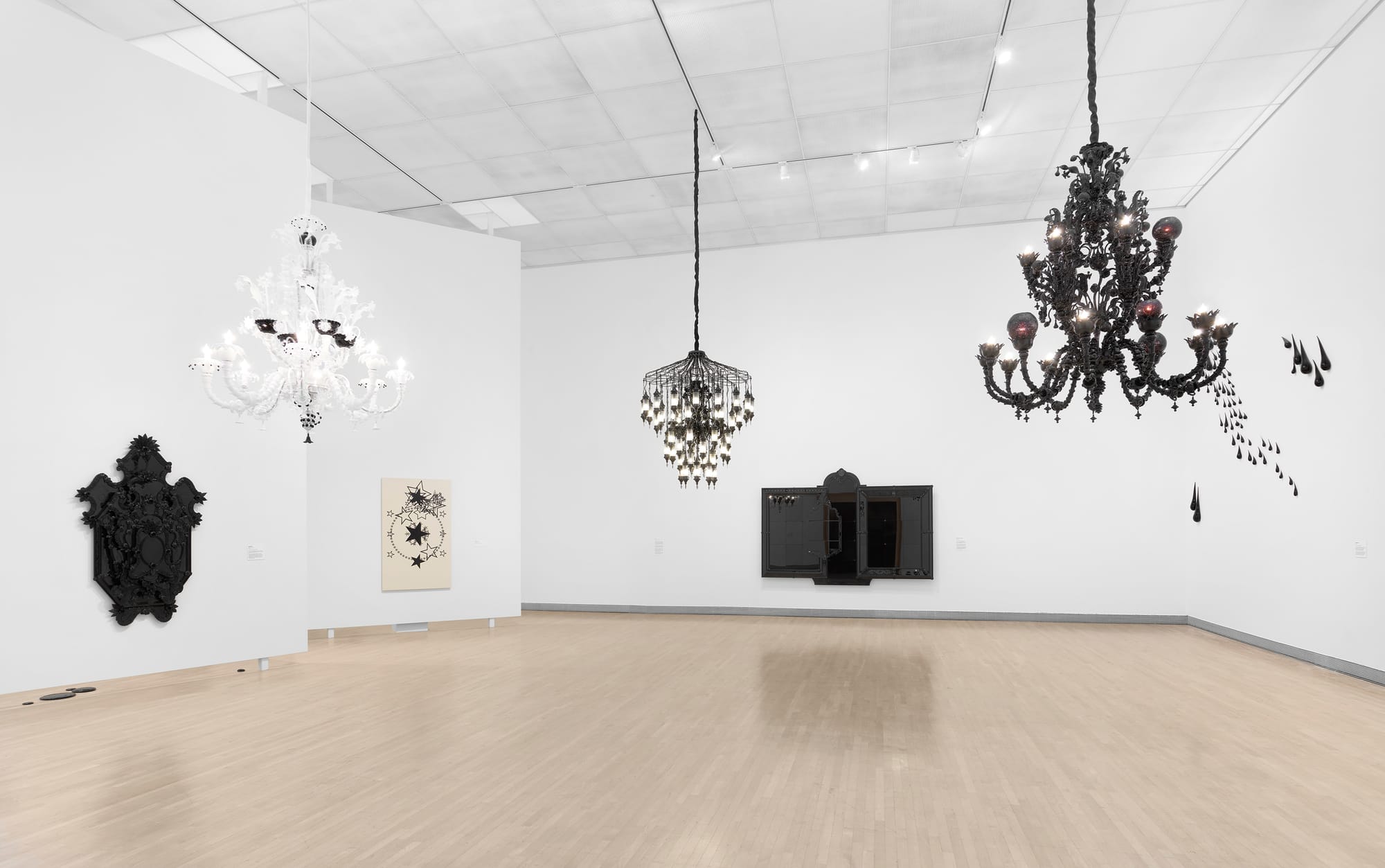 WALTHAM, Massachusetts — Before visitors even enter the Rose Art Museum’s main gallery to see Fred Wilson’s Reflections, they’ll encounter a black and white canvas depicting a trident, stars, a swan, and a half-circle gear with a machete through it. Wilson’s “The People” (2010), in the museum’s front hallway, sets the stage for what’s to come. The work introduces a shade of black that is deep, smooth, glossy, and seemingly endless — absorbing so much light that the white walls appear dull. Viewers may or may not decide to decode the cryptic iconography. More importantly, “The People” and other works in the survey consider the relationship that black and white have to each other: One is the absence of color, the other is all colors, and together they reinforce each other’s fictions.