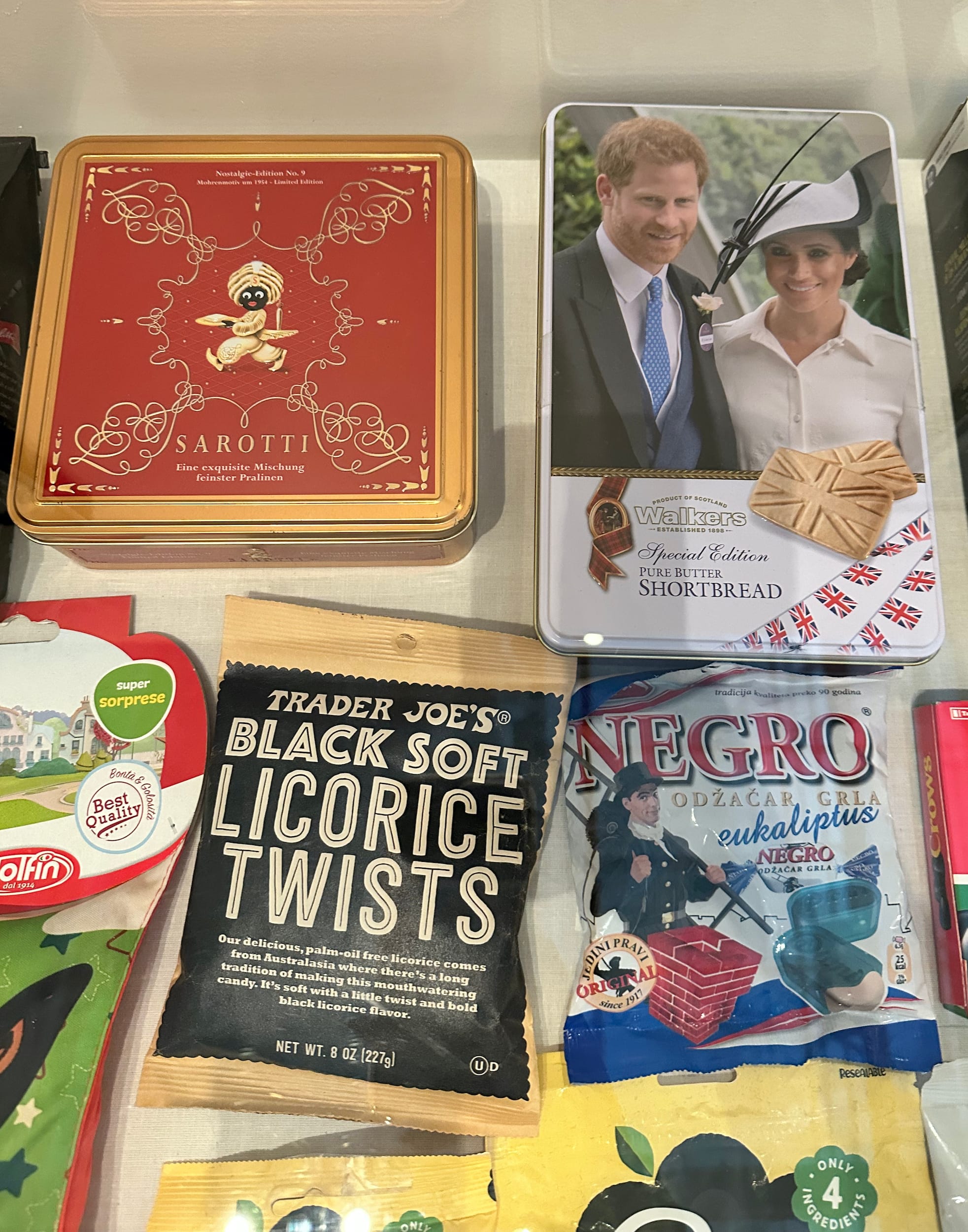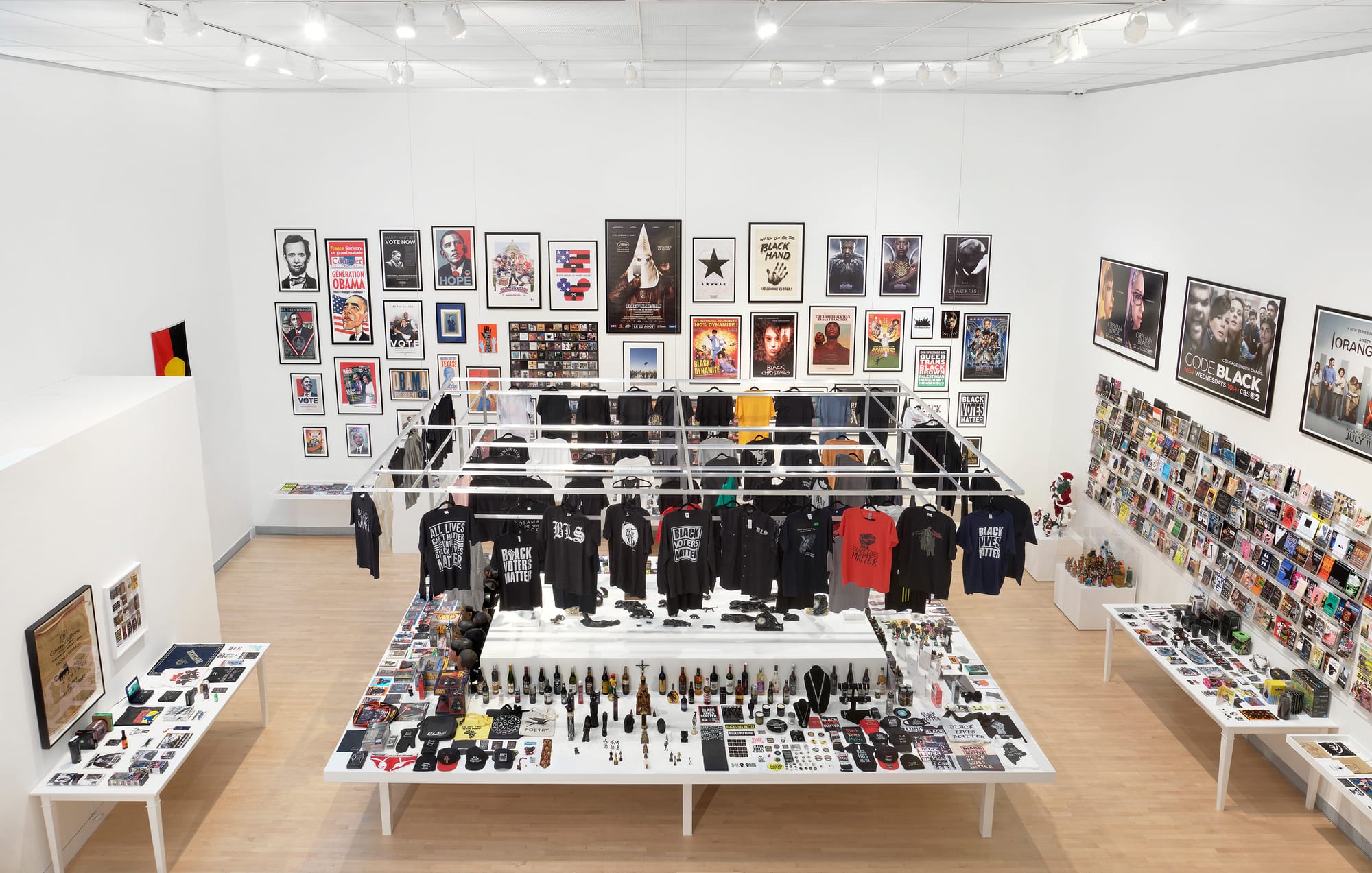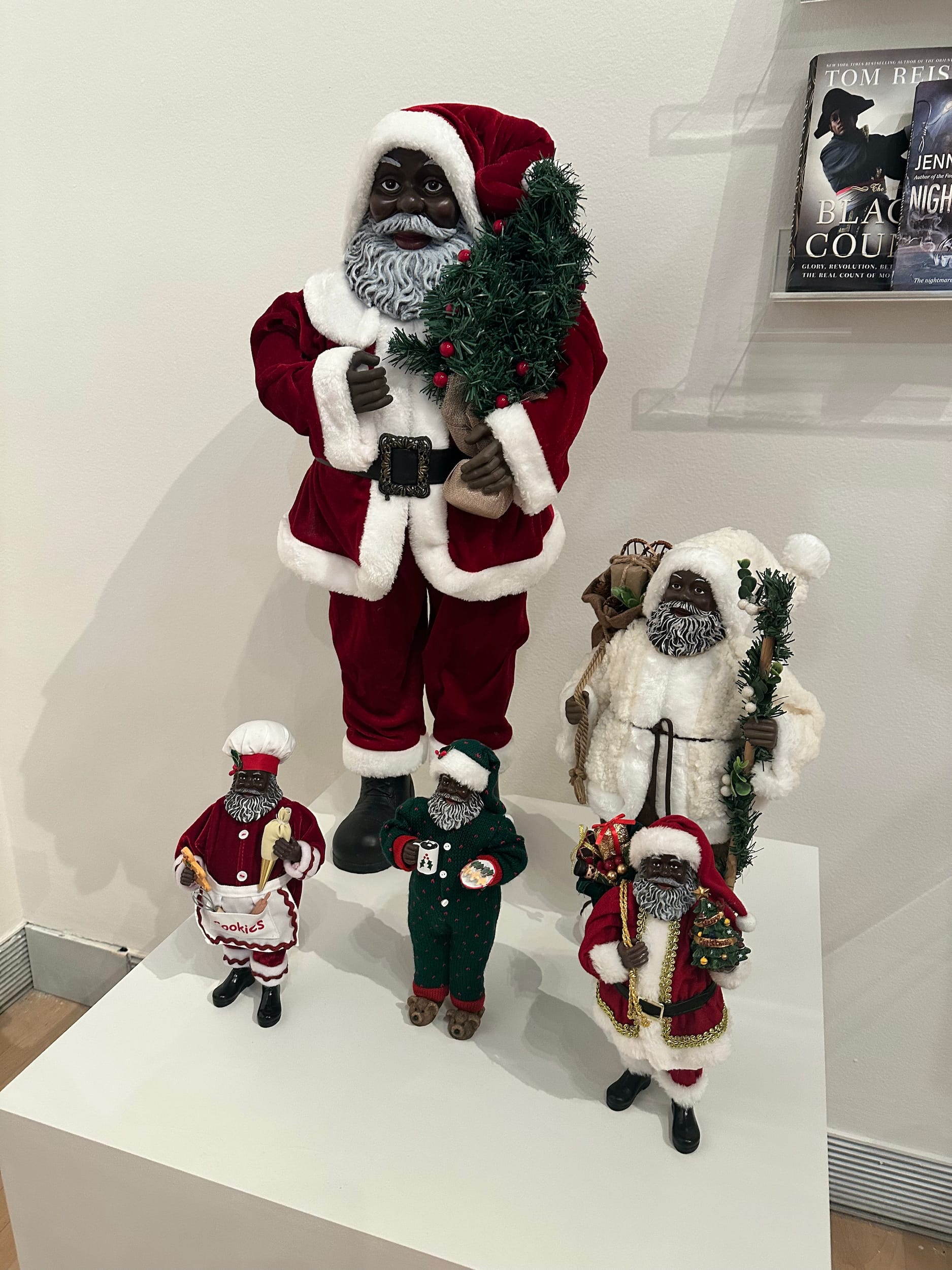 Wilson continues his critique of Western art institutions and museum classification with “North Africa, Europe, the Near East, and the Americas” (2003). This quadriptych depicts deep black figures with white sclera and teeth, who gaze at each other, as if to acknowledge a shared pain. The exhibition’s centerpiece is Black Now!, an installation of 2,500 objects Wilson has collected since 2005 that demands an unflinching gaze. This section pairs items with positive connotations, such as Black Santas or a cookie box depicting Megan Markle and Prince Harry, with negative items like Obama masks, minstrel characters on pralines, and sexual performance tablets. When I visited, I noticed many White viewers lingering in the first section of the exhibition, which is largely nonfigurative and decorative, while breezing through Black Now!'s paraphernalia. In the latter, objects are arranged in altar-like arrangements (i.e., a grouping of candles, liquor, and figurines) and summon uncomfortable minstrel associations. It made me wonder whether the section was intended as celebration or caricature.