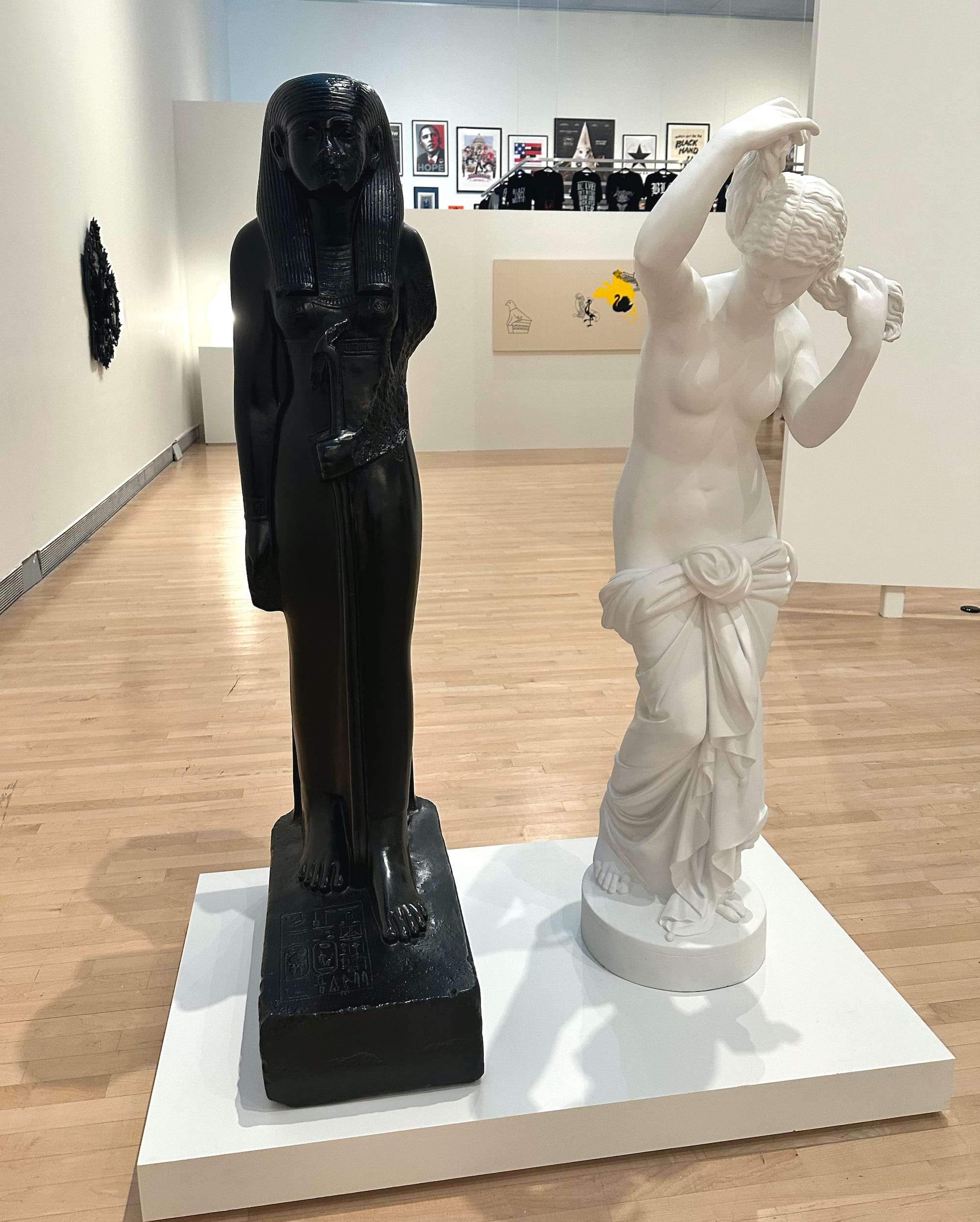 Wilson has explored these themes throughout his career, often through Murano glass, European decorative arts, and caryatids. Three glass chandeliers in the exhibition — “Dramatis Personae” (2022), “Eclipse” (2017), and “No Way But This” (2013) — and two Rococo-style mirrors adorn a wall in the first section, punctuated by black glass droplets. Rococo decorative arts are known for being seductively ornate. For Wilson, the three intricate floret chandeliers, one in black, one in white, and one in both, recall the interracial marriage of Desdemona and Othello in Shakespeare’s Othello. While miscegenation was common in Elizabethan Venice, a cosmopolitan port city, the play homes in on the social tension caused by Othello and Desdemona falling in love. Although most visitors wouldn’t recognize the works as allusions to Othello without reading the labels or titles, the chandeliers serve simultaneously as critiques of the underlying (and overt) racism of Euro-American art and objects through their color palette.