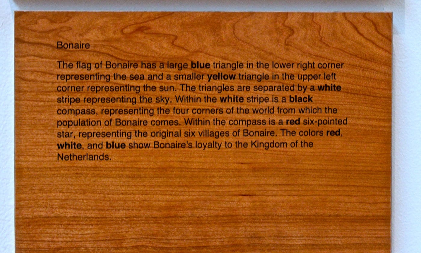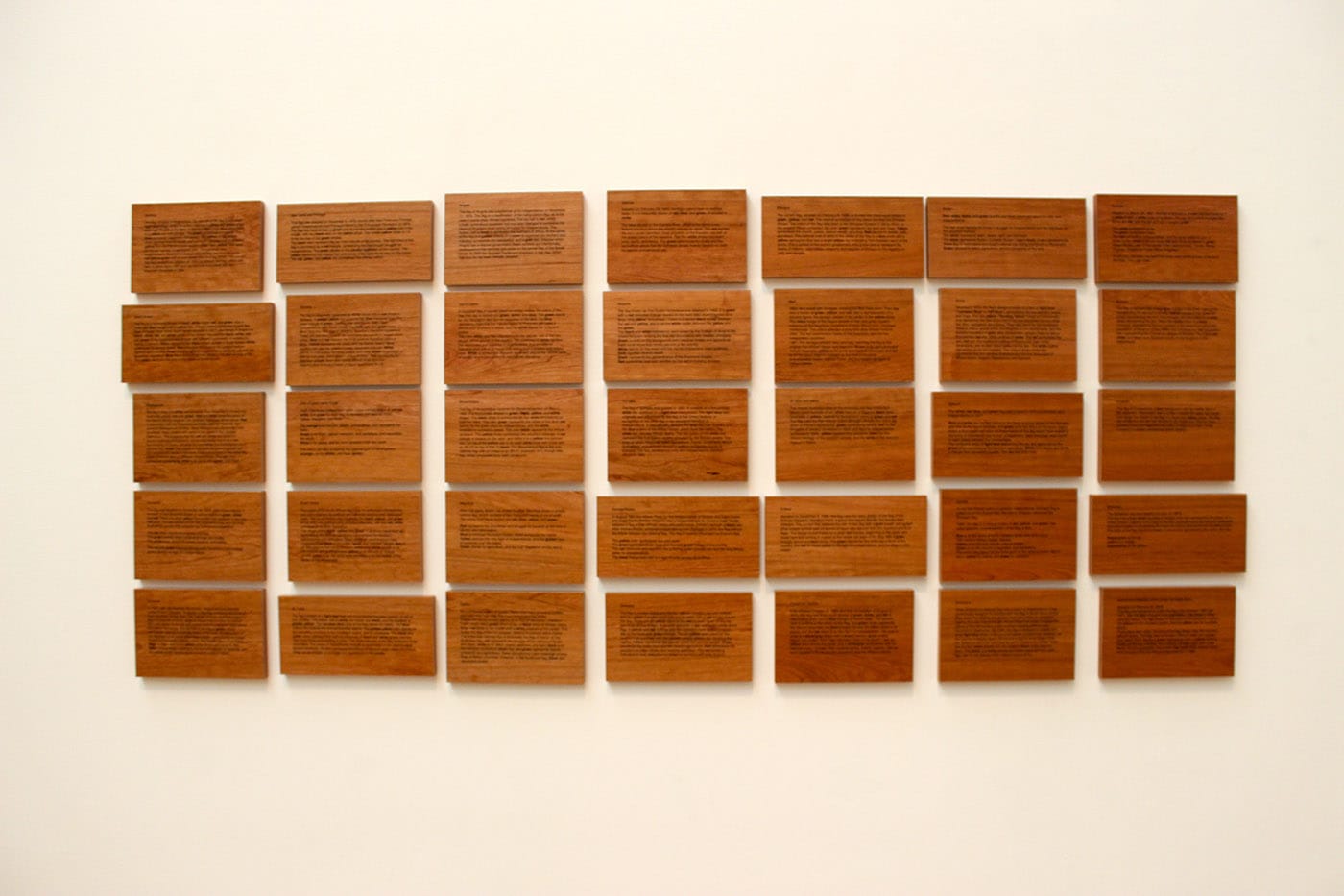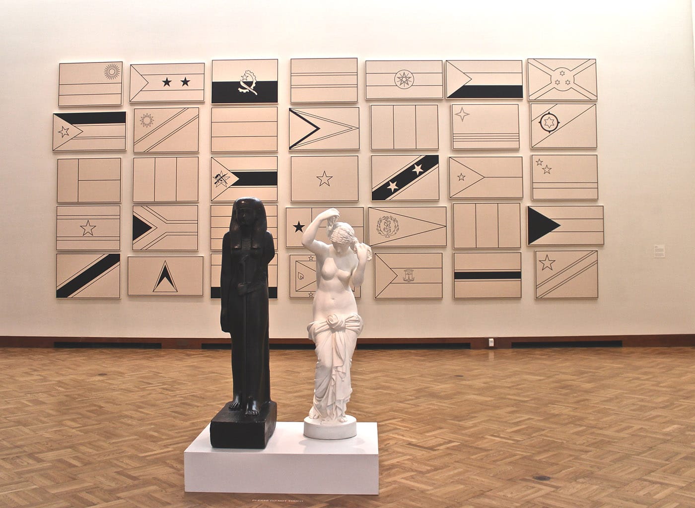 Perhaps this vagueness (and the poetic license it affords) was part of the original motivation in dubbing Othello a Moor — much like Sacha Baron Cohen leverages the perceived cultural ambiguity of Kazakhstan to lend force to his racist caricature, Borat. Throughout Wilson’s work there is a palpable desire to strip away the obfuscation of biased history, to get down to the fundamentals in black and white. This is captured in a wall of canvases depicting 35 flags of African and African diaspora nations, rendered with only their graphic elements in black and white. This 2009 body of work hangs adjacent to a corollary installation of 35 wooden plaques that describe the flags of these nations and what their symbols and colors represent. As often as not, the colors of a given flag directly reference the colonizing influence of a European or Western nation.