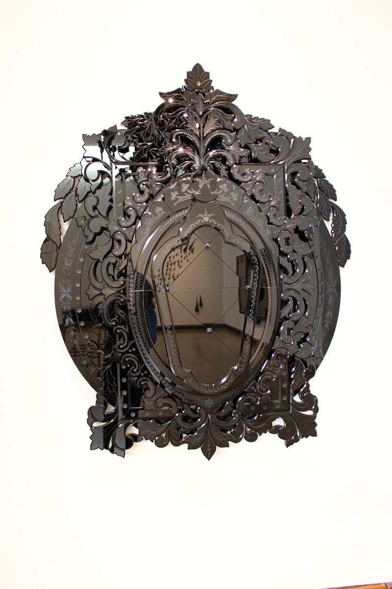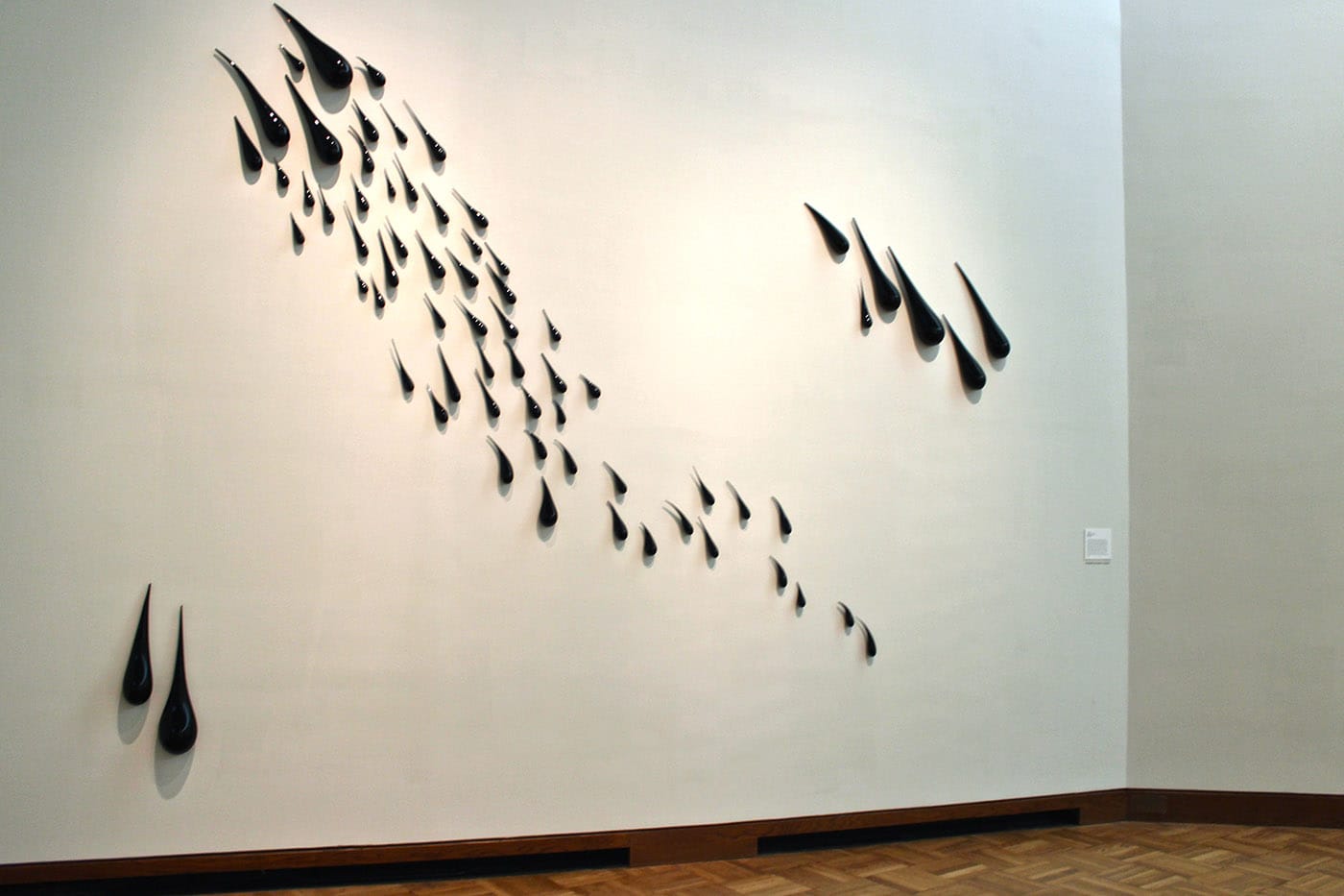 Black glass has been a longstanding and recurring motif in Wilson’s art, triggered by his work in Venice, where he discovered an obscured history of black labor within the centuries-old Murano glassworks for which the region is famous. Forming a kind of visual segue between the 2D works and the glass pieces is the wall-mounted “Whether or Not” (2014), a cluster of shiny, black, blown-glass teardrops that rain across an angled wall between the flags and a series of mirrors.