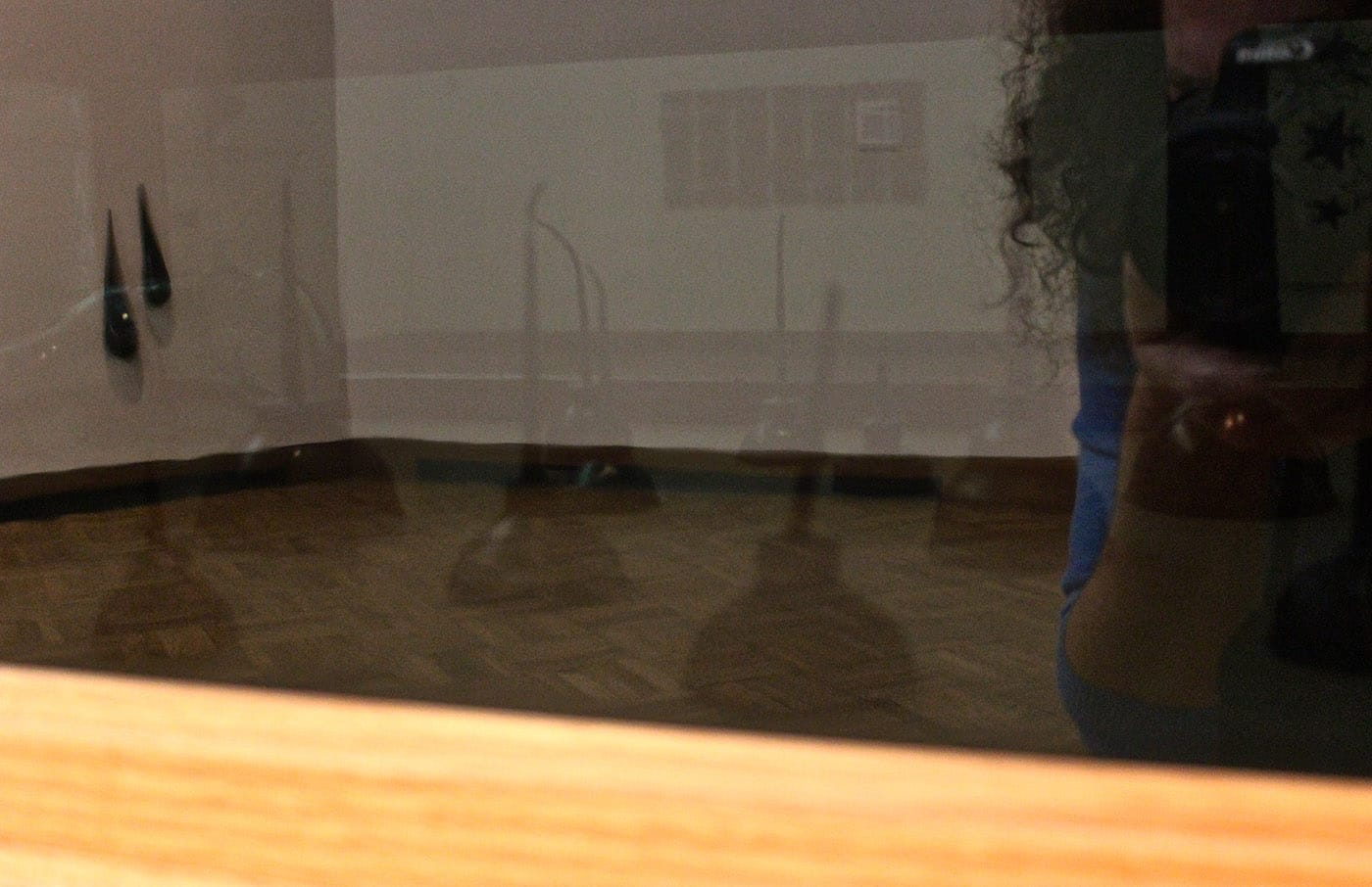 Against this backdrop stand two vitrines, “Black Memory” (2005) and “Black Present” (2006). Their forms suggest something solemn and coffin-like, even before a deep look through the nearly opaque black glass of “Black Present” reveals an interred resin skeleton, surrounded by ink wells and oil cans (“Black Memory” contains similar objects, minus the skeleton). The visual obfuscation of these pieces is so complete as to defy documentation — the contents of “Black Memory” and “Black Present” cannot be photographed very successfully, their dense and reflective surfaces bouncing back only external surroundings.