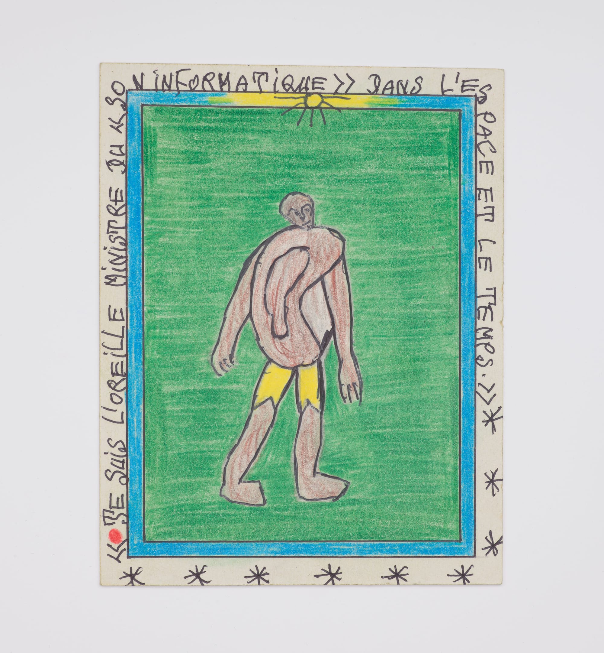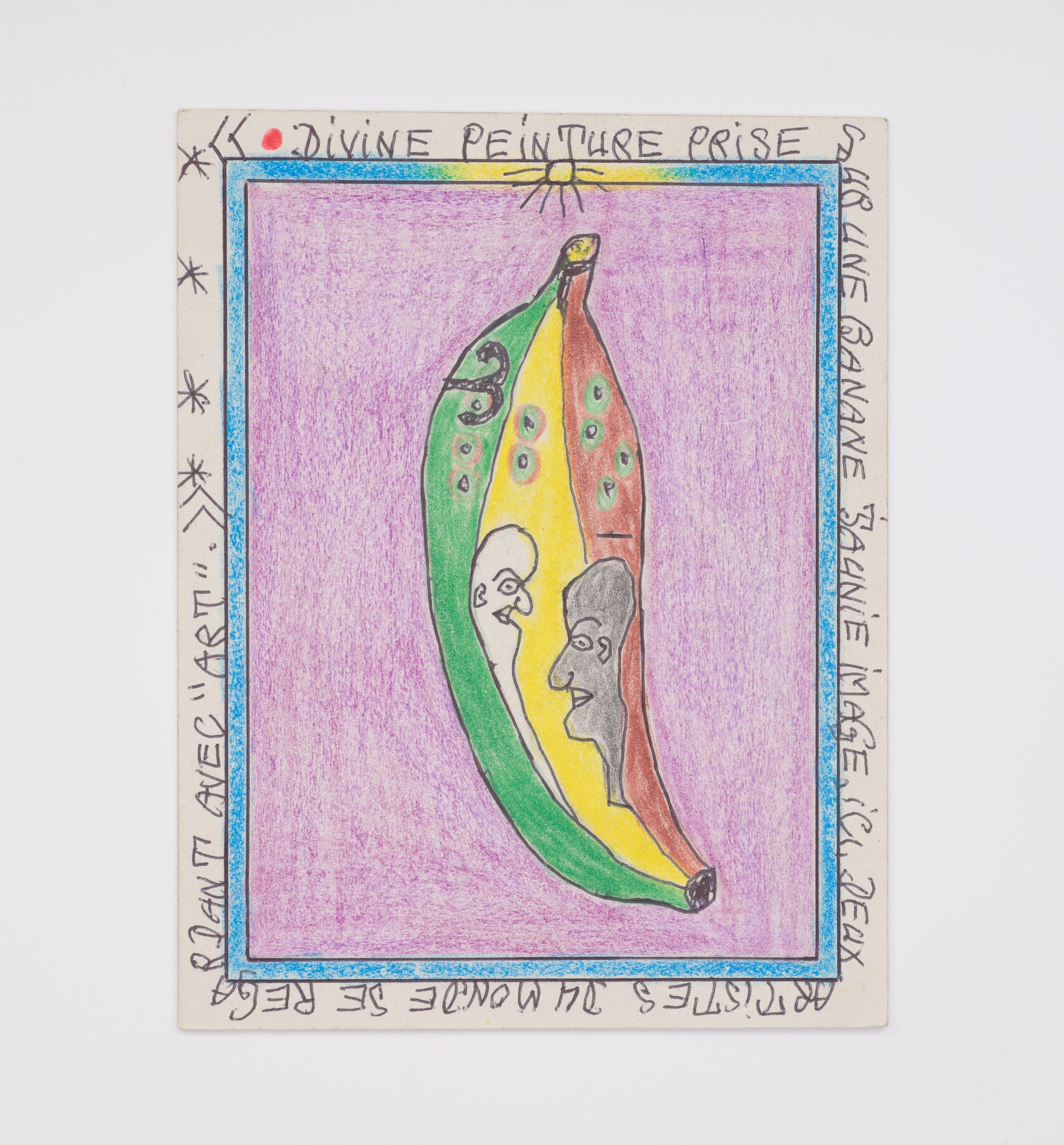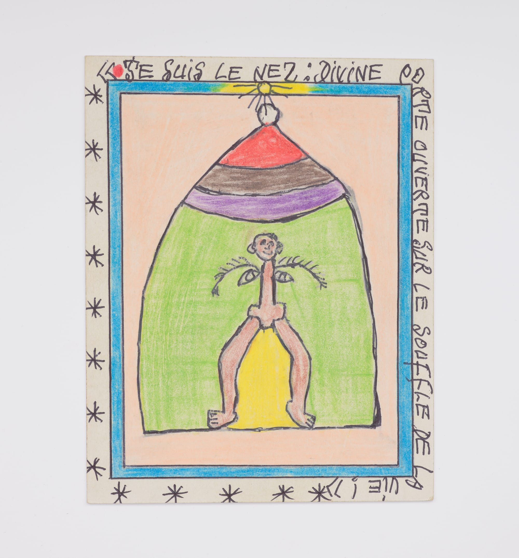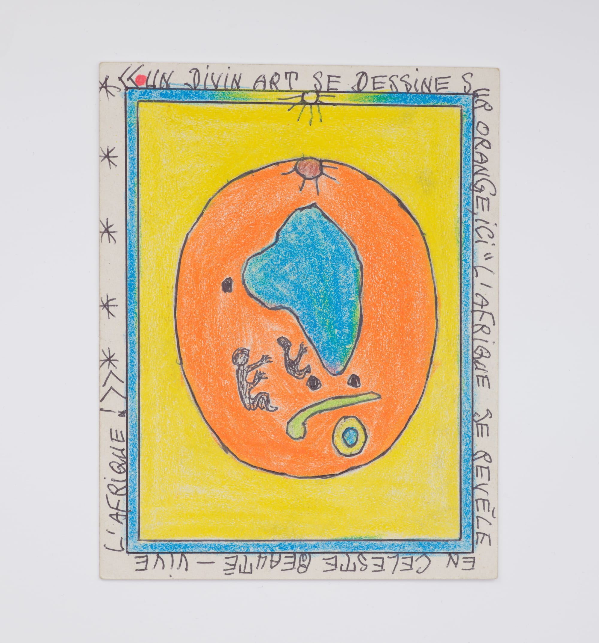 The pieces on view at the Cantor express the deep connection that Bruly Bouabré felt to the world around him, the Bété world. Many of the drawings appear to be parts of series to which he repeatedly returned. Four of the cards depict the artist’s mother, Tagro Dréhounou, dressed in the flags of various nations. Another four comprise a series titled Man and the art of dressing well, each individual work featuring a uniquely dressed dapper dude. (One man has facial scars that Bruly Bouabré tenderly renders.) Fruit is another domestic motif that recurs regularly. Bananas, kola nuts, and oranges are portrayed and described as providential gifts.