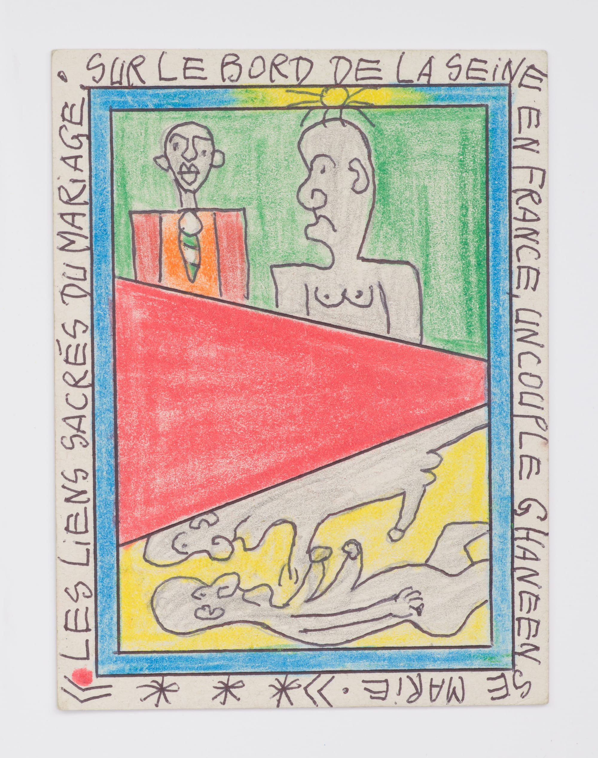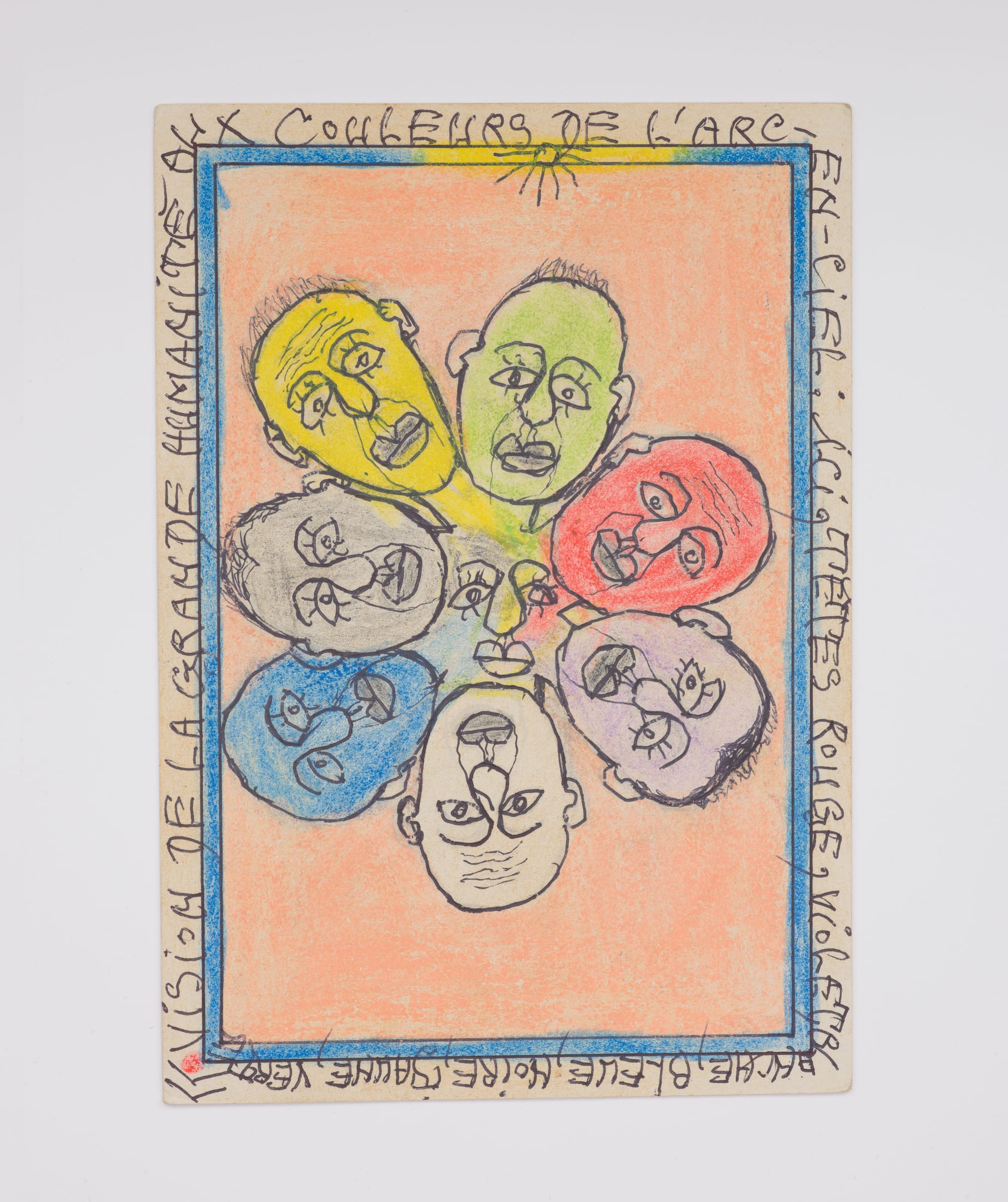 One way Bruly Bouabré preserved Bété culture was by recording Bété heritage and myths in crayon and ink drawings on postcard-sized pieces of paper. The Bété people did not have a writing system for their spoken language, so the artist created one and used it, along with French, to incorporate descriptions of these scenes within the composition. These drawings are the subject of Alphabété: The World Through the Eyes of Frédéric Bruly Bouabré, now on view at the Cantor Arts Center on the campus of Stanford University.