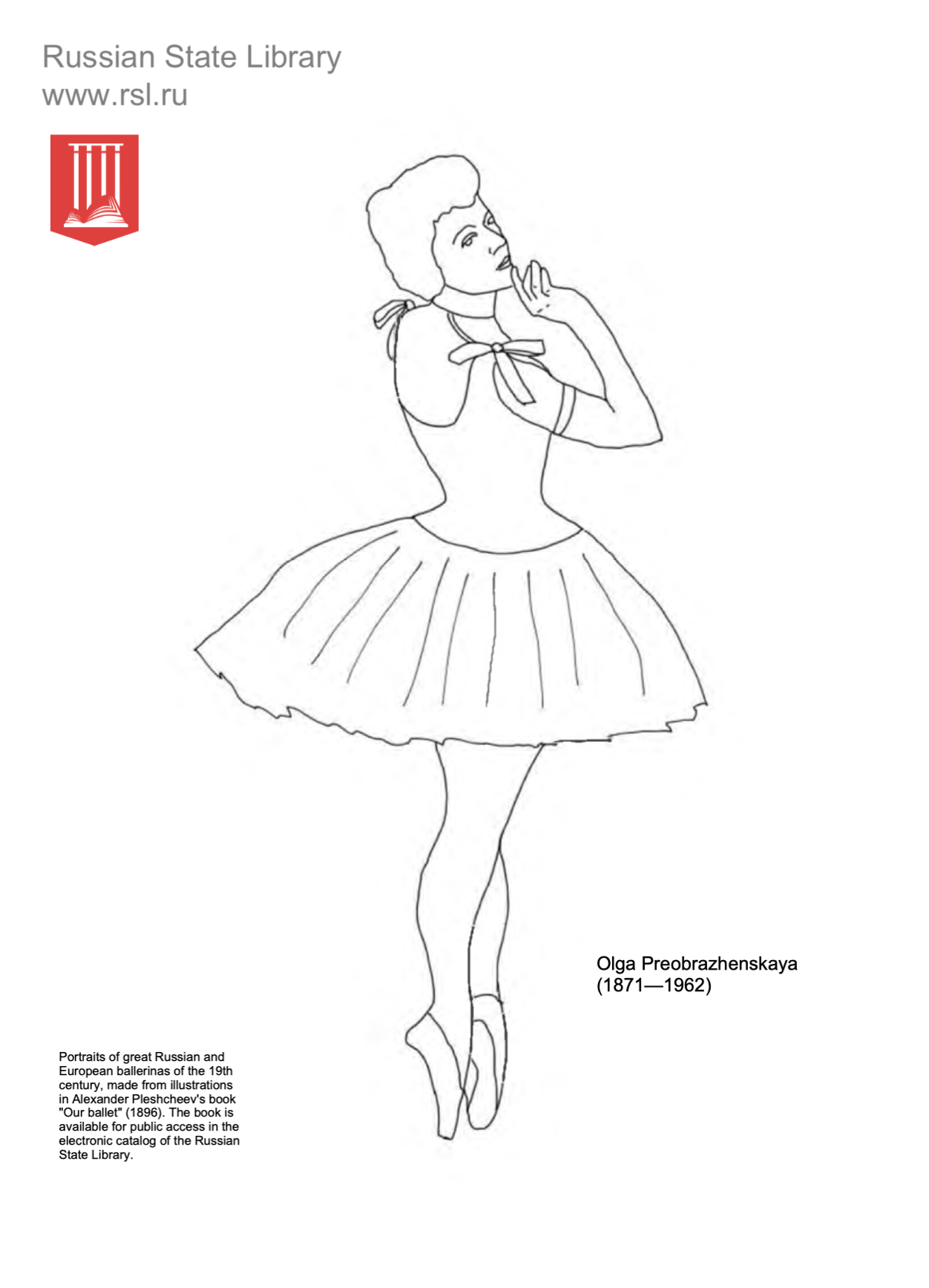 The Russian State Library is the largest library in Russia and the second largest library in the world. It provides images of famous ballerinas for coloring, drawn from the library’s archives.